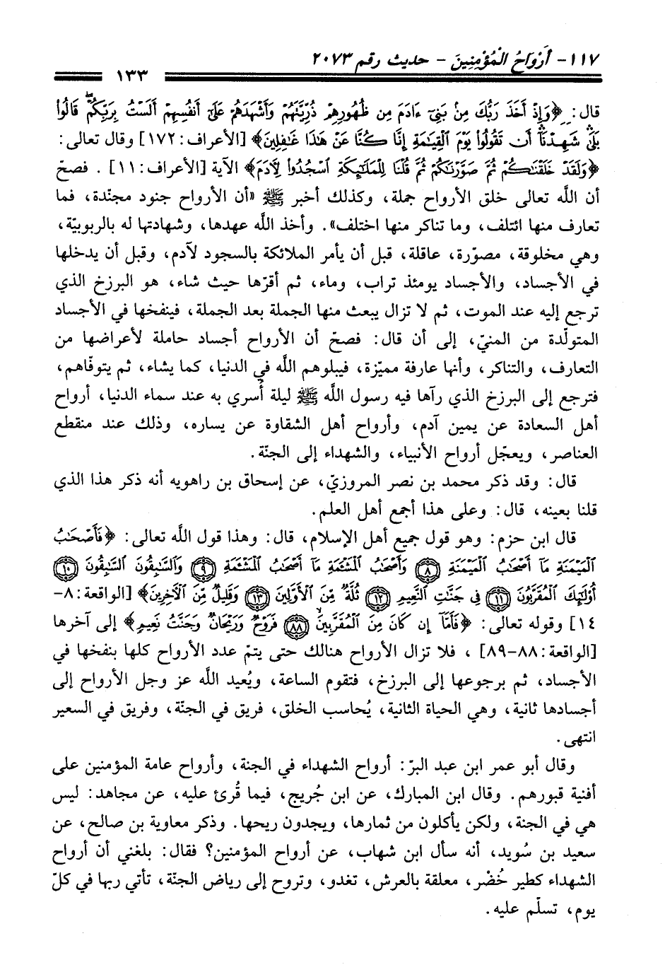 قال ابن حزم: وهو قول جميع أهل الإسلام، قال: وهذا قول اللَّه تعالى: {فَأَصْحَابُ الْمَيْمَنَةِ مَا أَصْحَابُ الْمَيْمَنَةِ (8) وَأَصْحَابُ الْمَشْأَمَةِ مَا أَصْحَابُ الْمَشْأَمَةِ (9) وَالسَّابِقُونَ السَّابِقُونَ (10) أُولَئِكَ الْمُقَرَّبُونَ (11) فِي جَنَّاتِ النَّعِيمِ (12) ثُلَّةٌ مِنَ الْأَوَّلِينَ (13) وَقَلِيلٌ مِنَ الْآخِرِينَ} [الواقعة: 8 - 14]، وقوله تعالى: {فَأَمَّا إِنْ كَانَ مِنَ الْمُقَرَّبِينَ (88) فَرَوْحٌ وَرَيْحَانٌ وَجَنَّتُ نَعِيمٍ} إلى آخرها [الواقعة: 88 - 89]، فلا تزال الأرواح هنالك حتى يتمّ عدد الأرواح كلها بنفخها في الأجساد، ثم برجوعها إلى البرزخ، فتقوم الساعة، ويُعيد اللَّه -عَزَّ وَجَلَّ- الأرواح إلى أجسادها ثانية، وهي الحياة الثانية، يُحاسب الخلق، فريق في الجنّة، وفريق في السعير انتهى.