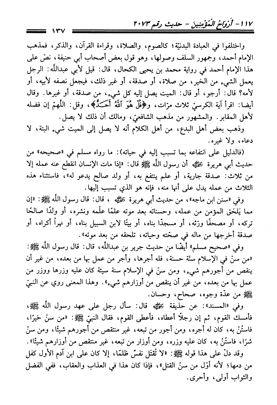 (فالدليل على انتفاعه بما تسبب إليه في حياته): ما رواه مسلم في "صحيحه" من حديث أبي هريرة - رضي اللَّه عنه - أن رسول اللَّه - صلى اللَّه عليه وسلم - قال: "إذا مات الإنسان انقطع عنه عمله إلا من ثلاث: صدقة جارية، أو علم ينتفع به، أو ولد صالح يدعو له"، فاستثناء هذه الثلاث من عمله يدلّ على أنها منه، فإنه هو الذي تسبب إليها.
