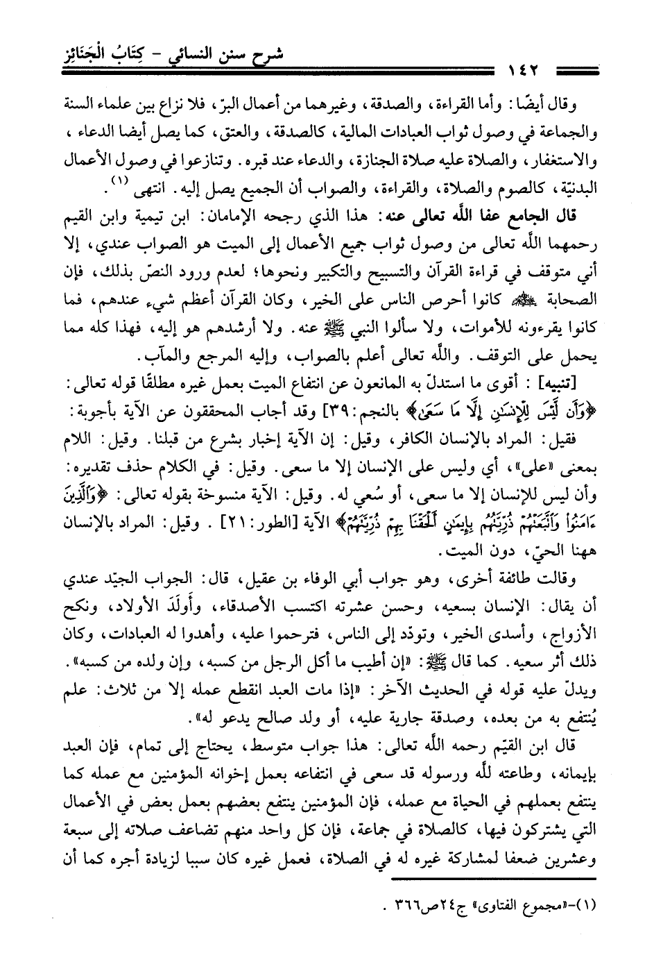[تنبيه]: أقوى ما استدلّ به المانعون عن انتفاع الميت بعمل غيره مطلقًا قوله تعالى: {وَأَنْ لَيْسَ لِلْإِنْسَانِ إِلَّا مَا سَعَى} [النجم: 39] وقد أجاب المحققون عن الآية بأجوبة: فقيل: المراد بالإنسان الكافر، وقيل: إن الآية إخبار بشرع من قبلنا. وقيل: اللام بمعنى "على"، أي وليس على الإنسان إلا ما سعى. وقيل: في الكلام حذف تقديره: وأن ليس للإنسان إلا ما سعى، أو سُعي له. وقيل: الآية منسوخة بقوله تعالى: {وَالَّذِينَ آمَنُوا وَاتَّبَعَتْهُمْ ذُرِّيَّتُهُمْ بِإِيمَانٍ أَلْحَقْنَا بِهِمْ ذُرِّيَّتَهُمْ} الآية [الطور: 21]. وقيل: المراد بالإنسان ههنا الحيّ، دون الميت.