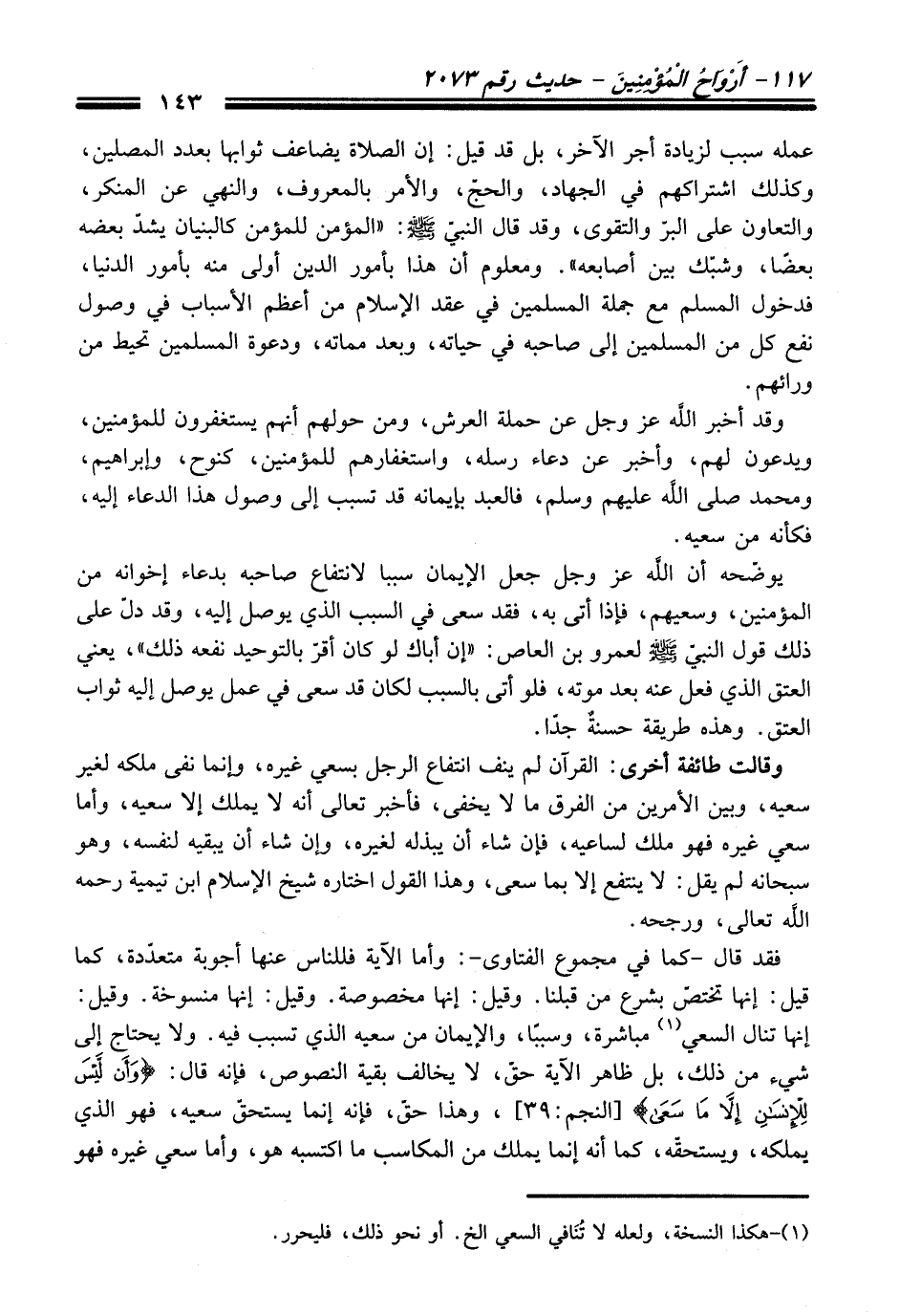 يوضّحه أن اللَّه -عَزَّ وَجَلَّ- جعل الإيمان سببا لانتفاع صاحبه بدعاء إخوانه من المؤمنين، وسعيهم، فإذا أتى به، فقد سعى في السبب الذي يوصل إليه، وقد دلّ على ذلك قول النبيّ - صلى اللَّه عليه وسلم - لعمرو بن العاص: "إن أباك لو كان أقرّ بالتوحيد نفعه ذلك"، يعني العتق الذي فعل عنه بعد موته، فلو أتى بالسبب لكان قد سعى في عمل يوصل إليه ثواب العتق. وهذه طريقة حسنةٌ جدًا.