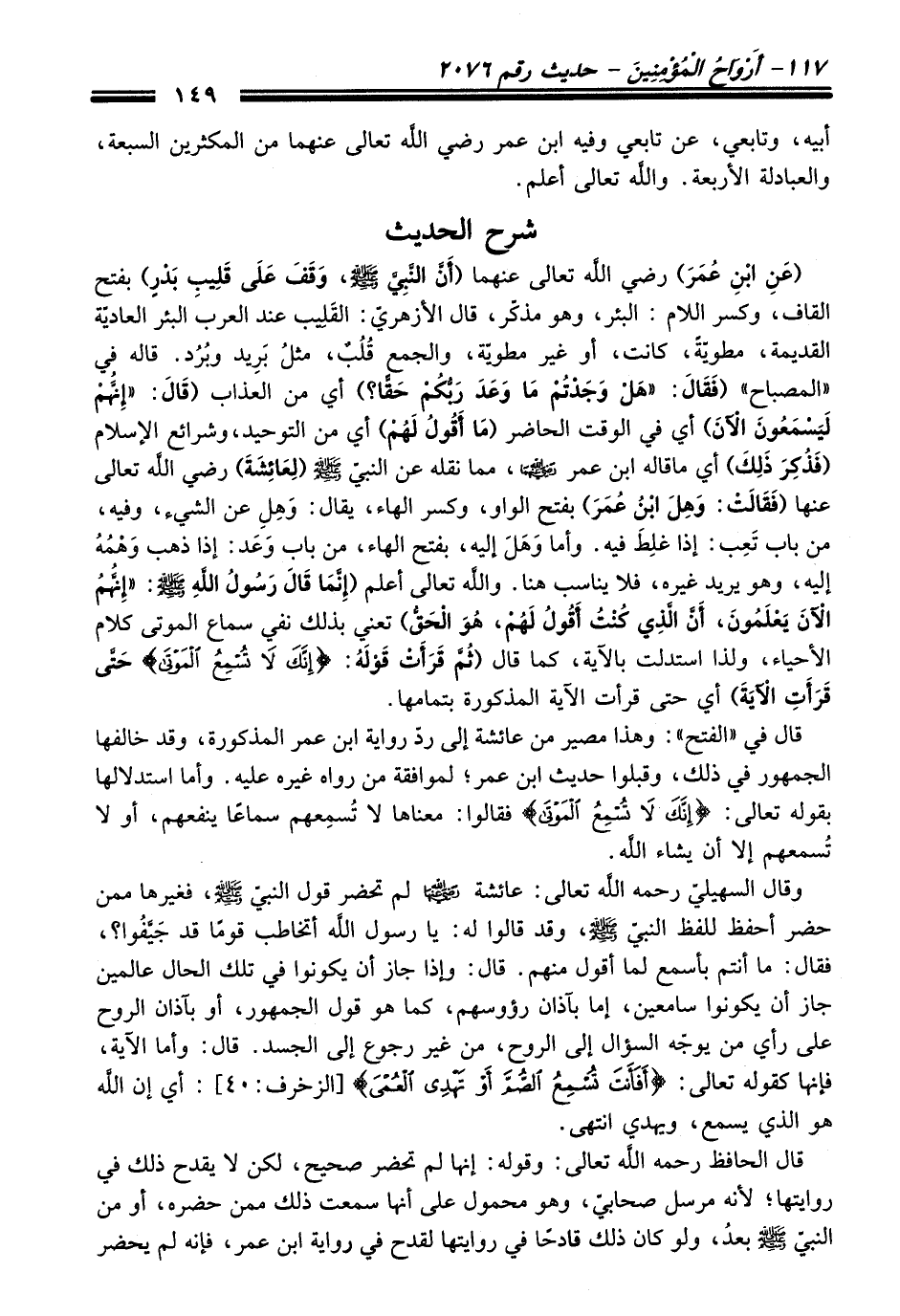 قال في "الفتح": وهذا مصير من عائشة إلى ردّ رواية ابن عمر المذكورة، وقد خالفها الجمهور في ذلك، وقبلوا حديث ابن عمر؛ لموافقة من رواه غيره عليه. وأما استدلالها بقوله تعالى: {إِنَّكَ لَا تُسْمِعُ الْمَوْتَى} فقالوا: معناها لا تُسمِعهم سماعًا ينفعهم، أو لا تُسمعهم إلا أن يشاء اللَّه.