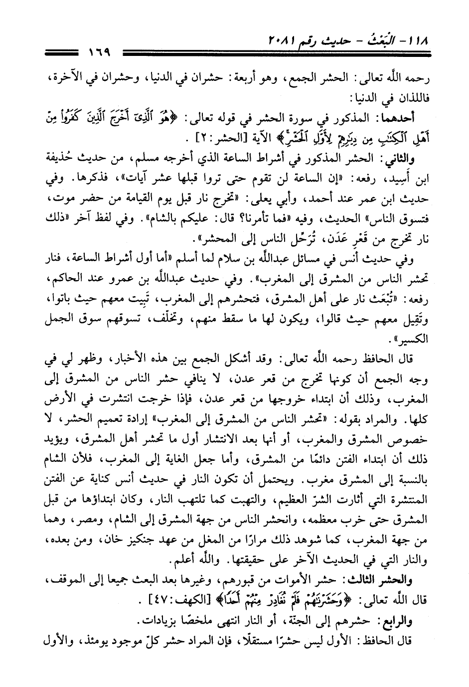 قال الحافظ -رَحِمَهُ اللَّهُ تَعَالَى-: وقد أشكل الجمع بين هذه الأخبار، وظهر لي في وجه الجمع أن كونها تخرج من قعر عدن، لا ينافي حشر الناس من المشرق إلى المغرب، وذلك أن ابتداء خروجها من قعر عدن، فإذا خرجت انتشرت في الأرض كلها. والمراد بقوله: "تحشر الناس من المشرق إلى المغرب" إرادة تعميم الحشر، لا خصوص المشرق والمغرب، أو أنها بعد الانتشار أول ما تحشر أهل المشرق، ويؤيد ذلك أن ابتداء الفتن دائمًا من المشرق، وأما جعل الغاية إلى المغرب، فلأن الشام بالنسبة إلى المشرق مغرب. ويحتمل أن تكون النار في حديث أنس كناية عن الفتن المنتشرة التي أثارت الشرّ العظيم، والتهبت كما تلتهب النار، وكان ابتداؤها من قبل المشرق حتى خرب معظمه، وانحشر الناس من جهة المشرق إلى الشام، ومصر، وهما من جهة المغرب، كما شوهد ذلك مرارًا من المغل من عهد جنكيز خان، ومن بعده، والنار التي في الحديث الآخر على حقيقتها. واللَّه أعلم.