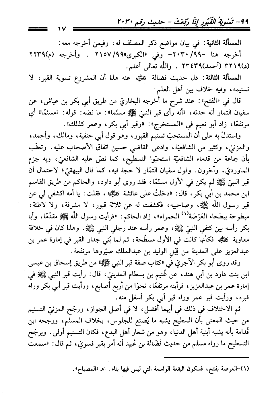 المسألة الثالثة: دلّ حديث فضالة - رضي اللَّه عنه - عنه هذا أن المشروع تسوية القبر، لا تسنيمه، وفيه حلاف بين أهل العلم: