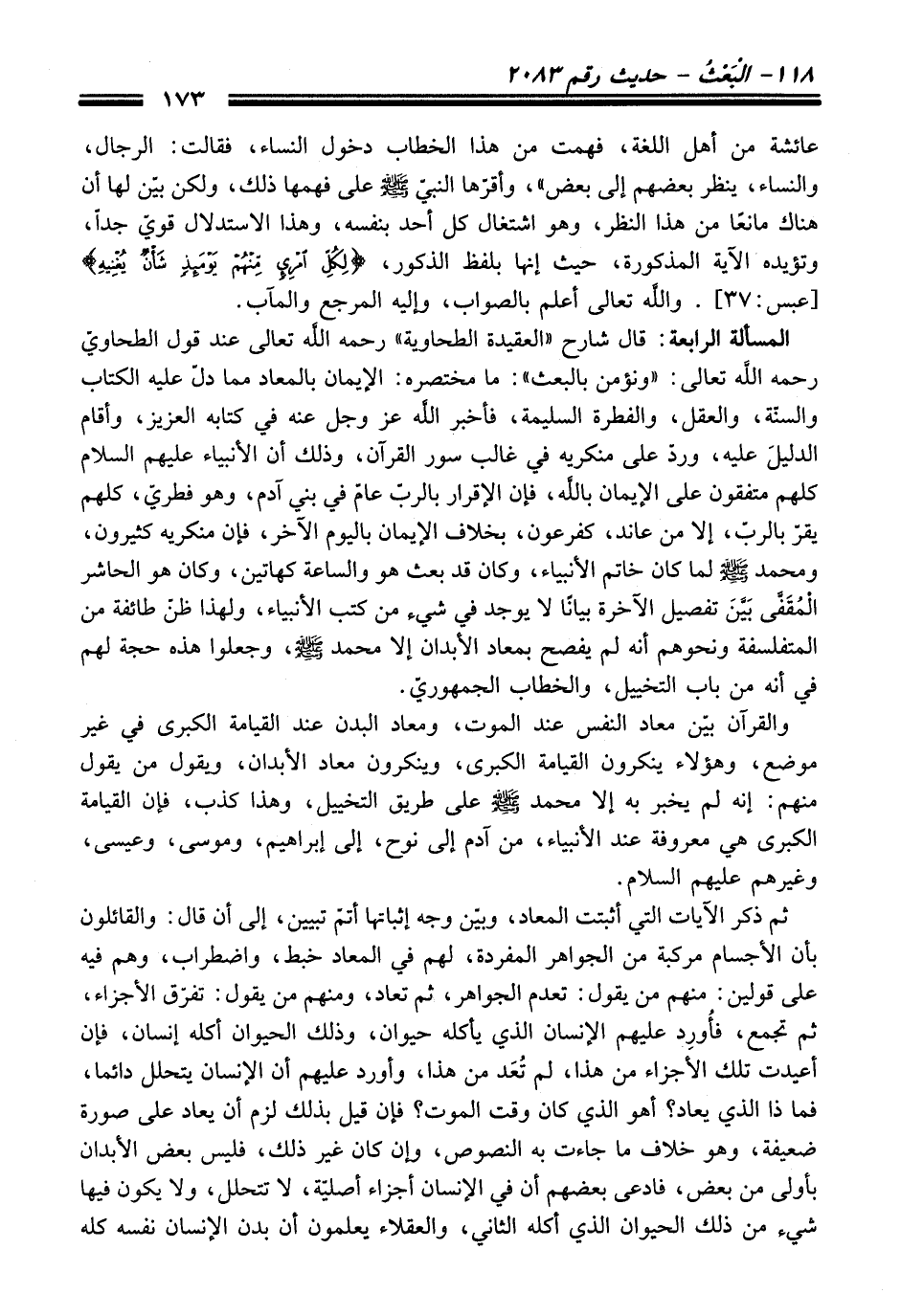 المسألة الرابعة: قال شارح "العقيدة الطحاوية" -رَحِمَهُ اللَّهُ تَعَالَى- عند قول الطحاويّ -رَحِمَهُ اللَّهُ تَعَالَى-: "ونؤمن بالبعث": ما مختصره: الإيمان بالمعاد مما دلّ عليه الكتاب والسنّة، والعقل، والفطرة السليمة، فأخبر اللَّه -عَزَّ وَجَلَّ- عنه في كتابه العزيز، وأقام الدليلَ عليه، وردّ على منكريه في غالب سور القرآن، وذلك أن الأنبياء - عليهم السلام - كلهم متفقون على الإيمان باللَّه، فإن الإقرار بالربّ عامّ في بني آدم، وهو فطريّ، كلهم يقرّ بالربّ إلا من عاند، كفرعون، بخلاف الإيمان باليوم الآخر، فإن منكريه كثيرون، ومحمد - صلى اللَّه عليه وسلم - لما كان خاتم الأنبياء، وكان قد بعث هو والساعة كهاتين، وكان هو الحاشر المُقَفَّى بَيَّنَ تفصيل الآخرة بيانًا لا يوجد في شيء من كتب الأنبياء، ولهذا ظنّ طائفة من المتفلسفة ونحوهم أنه لم يفصح بمعاد الأبدان إلا محمد - صلى اللَّه عليه وسلم -، وجعلوا هذه حجة لهم في أنه من باب التخييل، والخطاب الجمهوريّ.