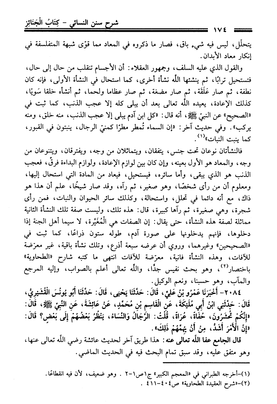 2084 - أَخْبَرَنَا عَمْرُو بْنُ عَلِيٍّ, قَالَ: حَدَّثَنَا يَحْيَى, قَالَ: حَدَّثَنَا أَبُو يُونُسَ الْقُشَيْرِيُّ, قَالَ: حَدَّثَنِي ابْنُ أَبِي مُلَيْكَةَ, عَنِ الْقَاسِمِ بْنِ مُحَمَّدٍ, عَنْ عَائِشَةَ, عَنِ النَّبِيِّ - صلى اللَّه عليه وسلم -, قَالَ: «إِنَّكُمْ تُحْشَرُونَ, حُفَاةً, عُرَاةً» , قُلْتُ: الرِّجَالُ وَالنِّسَاءُ, يَنْظُرُ بَعْضُهُمْ إِلَى بَعْضٍ؟ قَالَ: «إِنَّ الأَمْرَ أَشَدُّ, مِنْ أَنْ يُهِمَّهُمْ ذَلِكَ».