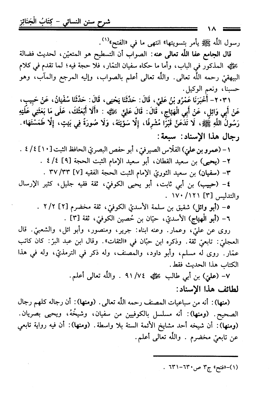 2031 - أَخْبَرَنَا عَمْرُو بْنُ عَلِيٍّ, قَالَ: حَدَّثَنَا يَحْيَى, قَالَ: حَدَّثَنَا سُفْيَانُ, عَنْ حَبِيبٍ, عَنْ أَبِي وَائِلٍ, عَنْ أَبِي الْهَيَّاجِ, قَالَ: قَالَ: عَلِيٌّ - رضي اللَّه عنه -: "أَلاَ أَبْعَثُكَ, عَلَى مَا بَعَثَنِي عَلَيْهِ رَسُولُ اللَّهِ - صلى اللَّه عليه وسلم -, لاَ تَدَعَنَّ قَبْرًا مُشْرِفًا, إِلاَّ سَوَّيْتَهُ, وَلاَ صُورَةً فِي بَيْتٍ, إِلاَّ طَمَسْتَهَا".