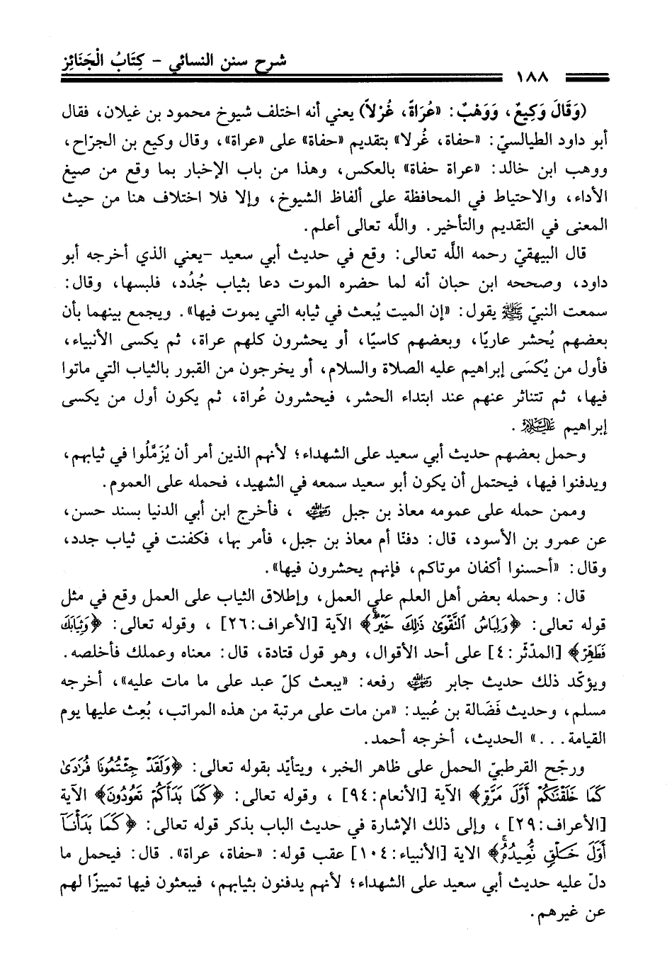 ورجّح القرطبيّ الحمل على ظاهر الخبر، ويتأيّد بقوله تعالى: {وَلَقَدْ جِئْتُمُونَا فُرَادَى كَمَا خَلَقْنَاكُمْ أَوَّلَ مَرَّةٍ} الآية [الأنعام: 94]، وقوله تعالى: {كَمَا بَدَأَكُمْ تَعُودُونَ} الآية [الأعراف: 29]، وإلى ذلك الإشارة في حديث الباب بذكر قوله تعالى: {كَمَا بَدَأْنَا أَوَّلَ خَلْقٍ نُعِيدُهُ} الآية [الأنبياء: 104] عقب قوله: "حفاة، عراة". قال: فيحمل ما دلّ عليه حديث أبي سعيد على الشهداء؛ لأنهم يدفنون بثيابهم، فيبعثون فيها تمييزًا لهم عن غيرهم.