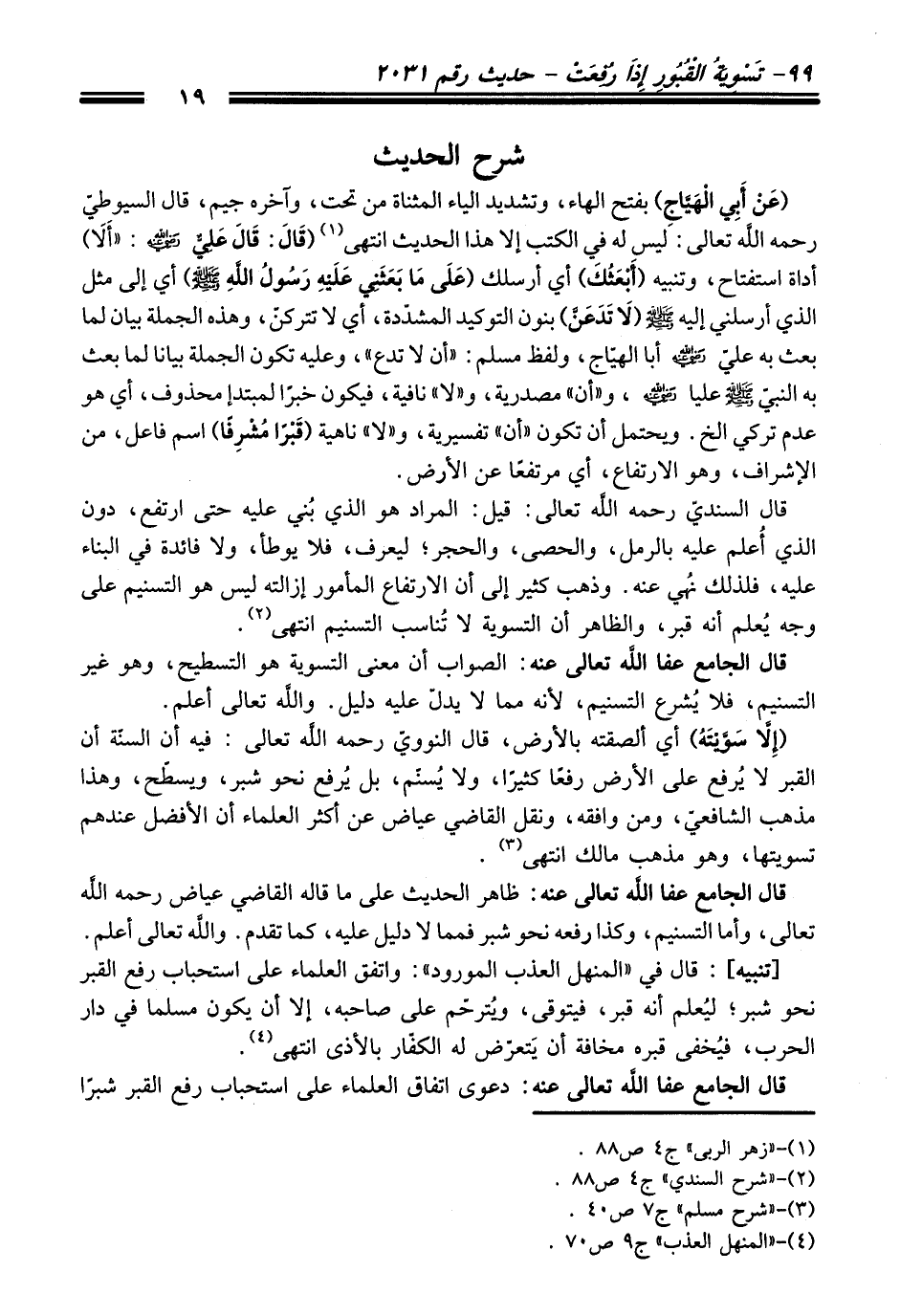 قال الجامع - عفا اللَّه تعالى عنه -: الصواب أن معنى التسوية هو التسطيح، وهو غير التسنيم، فلا يُشرع التسنيم، لأنه مما لا يدلّ عليه دليل. واللَّه تعالى أعلم.