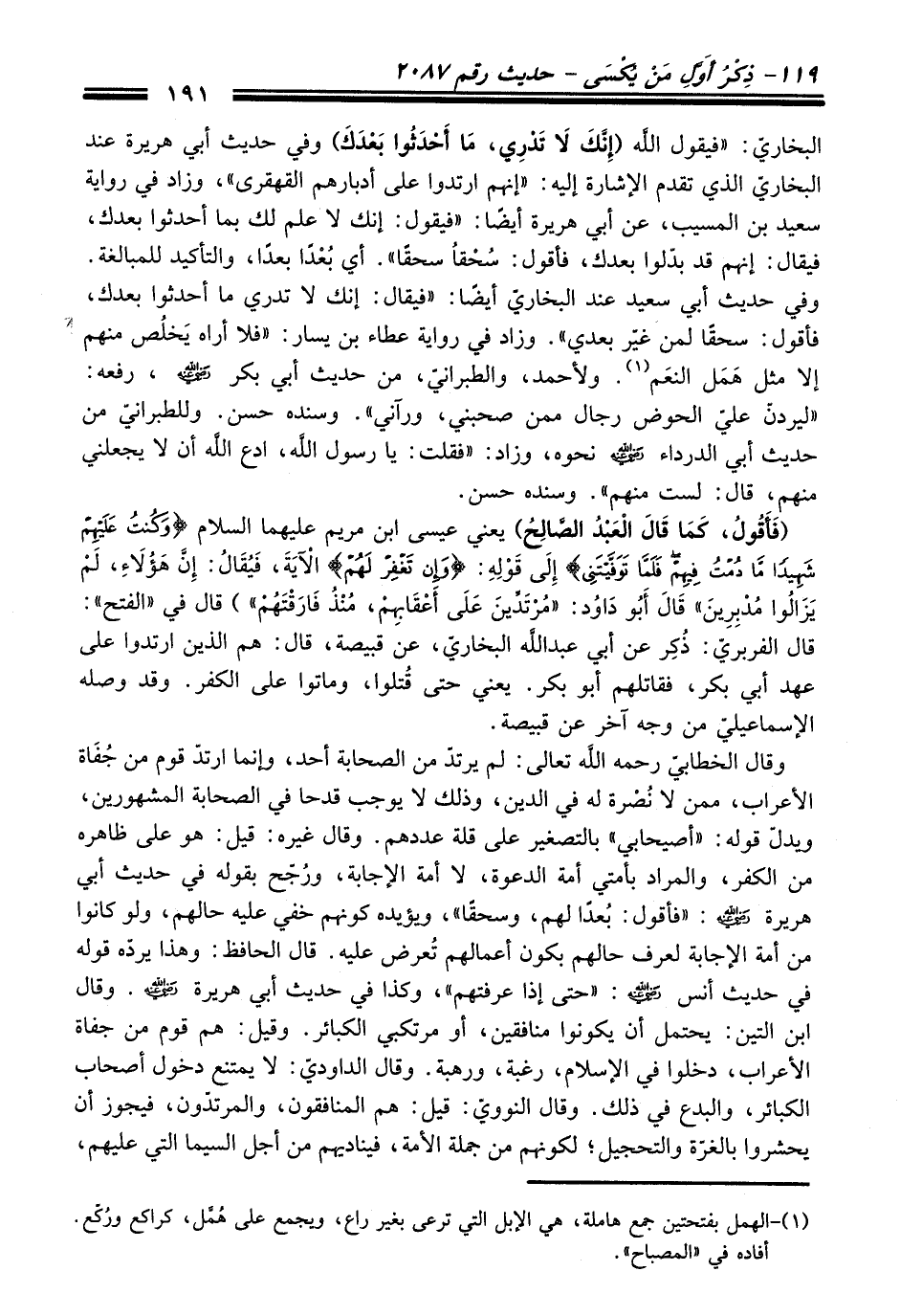 (¬1) - الهمل بفتحتين جمع هاملة، هي الإبل التي ترعى بغير راع، ويجمع على هُمَّل، كراكع ورُكّع. أفاده في "المصباح".