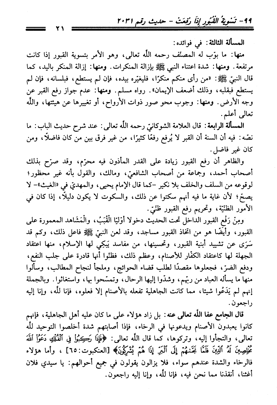 المسألة الرابعة: قال العلامة الشوكانيّ -رَحِمَهُ اللَّهُ تَعَالَى-: عند شرح حديث الباب: ما نصّه: فيه أن السنة أن القبر لا يُرفع رفعًا كثيرًا، من غير فرق بين من كان فاضلًا، ومن كان غير فاضل.