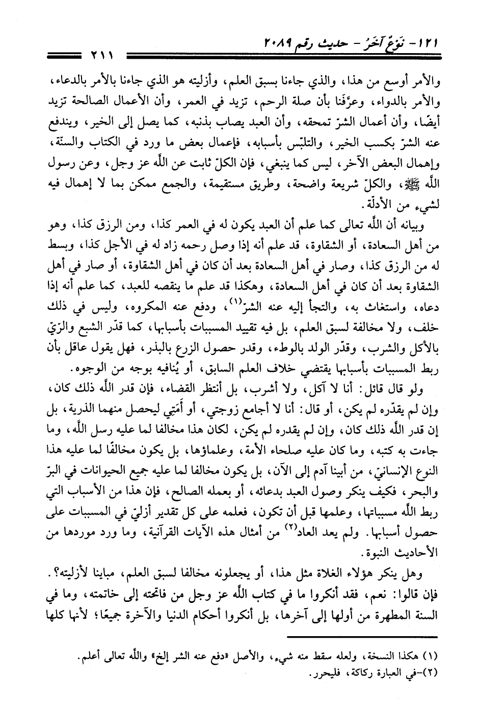 والأمر أوسع من هذا، والذي جاءنا بسبق العلم، وأزليته هو الذي جاءنا بالأمر بالدعاء، والأمر بالدواء، وعرَّفَنا بأن صلة الرحم، تزيد في العمر، وأن الأعمال الصالحة تزيد أيضًا، وأن أعمال الشرّ تمحقه، وأن العبد يصاب بذنبه، كما يصل إلى الخير، ويندفع عنه الشرّ بكسب الخير، والتلبّس بأسبابه، فإعمال بعض ما ورد في الكتاب والسنّة، وإهمال البعض الآخر، ليس كما ينبغي، فإن الكلّ ثابت عن اللَّه -عَزَّ وَجَلَّ-، وعن رسول اللَّه - صلى اللَّه عليه وسلم -، والكلّ شريعة واضحة، وطريق مستقيمة، والجمع ممكن بما لا إهمال فيه لشيء من الأدلّة.