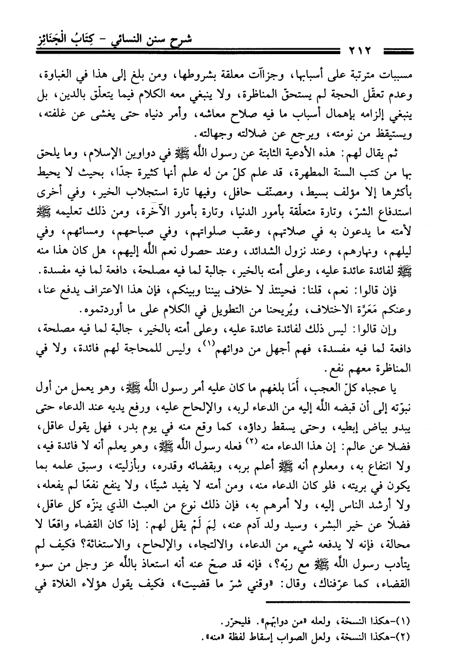 ثم يقال لهم: هذه الأدعية الثابتة عن رسول اللَّه - صلى اللَّه عليه وسلم - في دواوين الإسلام، وما يلحق بها من كتب السنة المطهرة، قد علم كلّ من له علم أنها كثيرة جدًّا، بحيث لا يحيط بأكثرها إلا مؤلف بسيط، ومصنّف حافل، وفيها تارة استجلاب الخير، وفي أخرى استدفاع الشرّ، وتارة متعلّقة بامور الدنيا، وتارة بأمور الآخرة، ومن ذلك تعليمه - صلى اللَّه عليه وسلم - لأمته ما يدعون به في صلاتهم، وعقب صلواتهم، وفي صباحهم، ومسائهم، وفي ليلهم، ونهارهم، وعند نزول الشدائد، وعند حصول نعم اللَّه إليهم، هل كان هذا منه - صلى اللَّه عليه وسلم - لفائدة عائدة عليه، وعلى أمته بالخير، جالبة لما فيه مصلحة، دافعة لما فيه مفسدة.