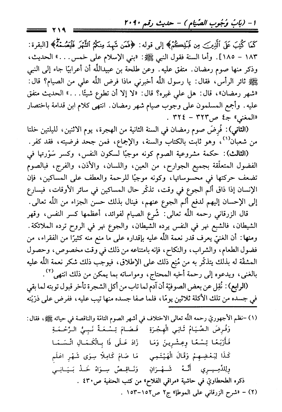 كَمَا كُتِبَ عَلَى الَّذِينَ مِنْ قَبْلِكُمْ} إلى قوله: {فَمَنْ شَهِدَ مِنْكُمُ الشَّهْرَ فَلْيَصُمْهُ} [البقرة: 183 - 185]. وأما السنة فقول النبي - صلى اللَّه عليه وسلم -: "بني الإسلام على خمس ... " الحديث، وذكر منها صوم رمضان. متفق عليه. وعن طلحة بن عبيد اللَّه أن أعرابيًا جاء إلى النبي - صلى اللَّه عليه وسلم - ثائر الرأس، فقال: يا رسول اللَّه أخبرني ماذا فرض اللَّه علي من الصيام؟ قال: "شهر رمضان"، قال: هل علي غيره؟ قال: "لا إلا أن تطوع شيئًا ... " الحديث متفق عليه. وأجمع المسلمون على وجوب صيام شهر رمضان. انتهى كلام ابن قدامة باختصار "المغني" جـ 4 ص 323 - 324.