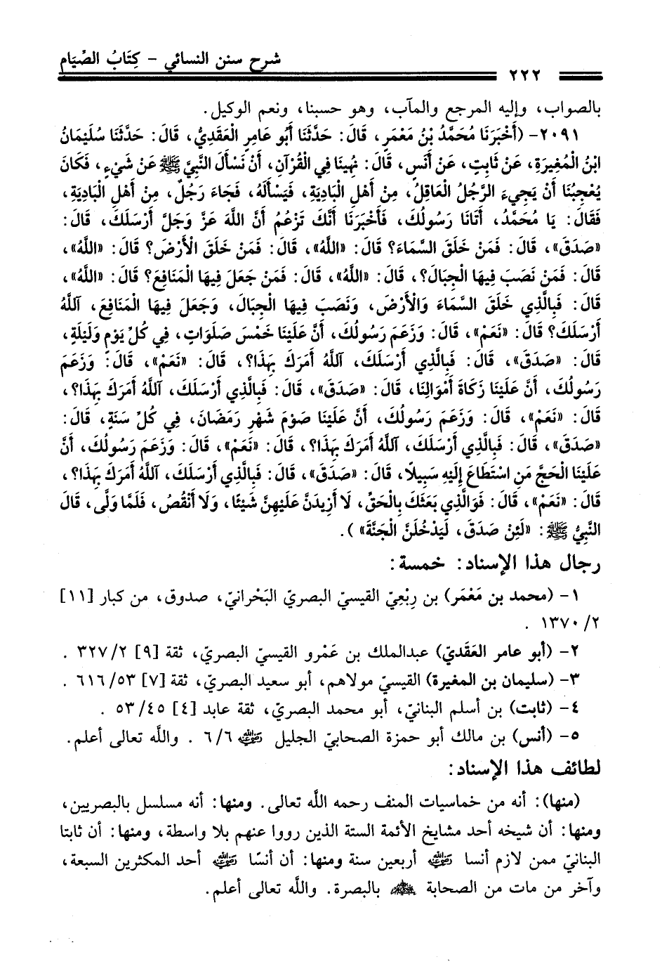 2091 - (أَخْبَرَنَا مُحَمَّدُ بْنُ مَعْمَرٍ, قَالَ: حَدَّثَنَا أَبُو عَامِرٍ الْعَقَدِيُّ, قَالَ: حَدَّثَنَا سُلَيْمَانُ بْنُ الْمُغِيرَةِ, عَنْ ثَابِتٍ, عَنْ أَنَسٍ, قَالَ: نُهِينَا فِي الْقُرْآنِ, أَنْ نَسْأَلَ النَّبِيَّ - صلى اللَّه عليه وسلم - عَنْ شَيْءٍ, فَكَانَ يُعْجِبُنَا أَنْ يَجِيءَ الرَّجُلُ الْعَاقِلُ, مِنْ أَهْلِ الْبَادِيَةِ, فَيَسْأَلَهُ, فَجَاءَ رَجُلٌ, مِنْ أَهْلِ الْبَادِيَةِ, فَقَالَ: يَا مُحَمَّدُ, أَتَانَا رَسُولُكَ, فَأَخْبَرَنَا أَنَّكَ تَزْعُمُ أَنَّ اللَّهَ -عَزَّ وَجَلَّ- أَرْسَلَكَ, قَالَ: «صَدَقَ» , قَالَ: فَمَنْ خَلَقَ السَّمَاءَ؟ قَالَ: «اللَّهُ» , قَالَ: فَمَنْ خَلَقَ الأَرْضَ؟ قَالَ: «اللَّهُ» , قَالَ: فَمَنْ نَصَبَ فِيهَا الْجِبَالَ؟ قَالَ: «اللَّهُ» , قَالَ: فَمَنْ جَعَلَ فِيهَا الْمَنَافِعَ؟ قَالَ: «اللَّهُ» , قَالَ: فَبِالَّذِي خَلَقَ السَّمَاءَ وَالأَرْضَ, وَنَصَبَ فِيهَا الْجِبَالَ, وَجَعَلَ فِيهَا الْمَنَافِعَ, آللَّهُ أَرْسَلَكَ؟ قَالَ: «نَعَمْ» , قَالَ: وَزَعَمَ رَسُولُكَ, أَنَّ عَلَيْنَا خَمْسَ صَلَوَاتٍ, فِي كُلِّ يَوْمٍ وَلَيْلَةٍ, قَالَ: «صَدَقَ» , قَالَ: فَبِالَّذِي أَرْسَلَكَ, آللَّهُ أَمَرَكَ بِهَذَا؟ قَالَ: «نَعَمْ» , قَالَ: وَزَعَمَ رَسُولُكَ, أَنَّ عَلَيْنَا زَكَاةَ أَمْوَالِنَا, قَالَ: «صَدَقَ» , قَالَ: فَبِالَّذِي أَرْسَلَكَ, آللَّهُ أَمَرَكَ بِهَذَا؟ قَالَ: «نَعَمْ» , قَالَ: وَزَعَمَ رَسُولُكَ, أَنَّ عَلَيْنَا صَوْمَ شَهْرِ رَمَضَانَ, فِي كُلِّ سَنَةٍ, قَالَ: «صَدَقَ» , قَالَ: فَبِالَّذِي أَرْسَلَكَ, آللَّهُ أَمَرَكَ بِهَذَا؟ قَالَ: «نَعَمْ». قَالَ: وَزَعَمَ رَسُولُكَ, أَنَّ عَلَيْنَا الْحَجَّ مَنِ اسْتَطَاعَ إِلَيْهِ سَبِيلاً, قَالَ: «صَدَقَ» , قَالَ: فَبِالَّذِي أَرْسَلَكَ, آللَّهُ أَمَرَكَ بِهَذَا؟ , قَالَ: «نَعَمْ». قَالَ: فَوَالَّذِي بَعَثَكَ بِالْحَقِّ, لاَ أَزِيدَنَّ عَلَيْهِنَّ شَيْئًا, وَلاَ أَنْقُصُ, فَلَمَّا وَلَّى, قَالَ: النَّبِيُّ - صلى اللَّه عليه وسلم -: «لَئِنْ صَدَقَ, لَيَدْخُلَنَّ الْجَنَّةَ»).