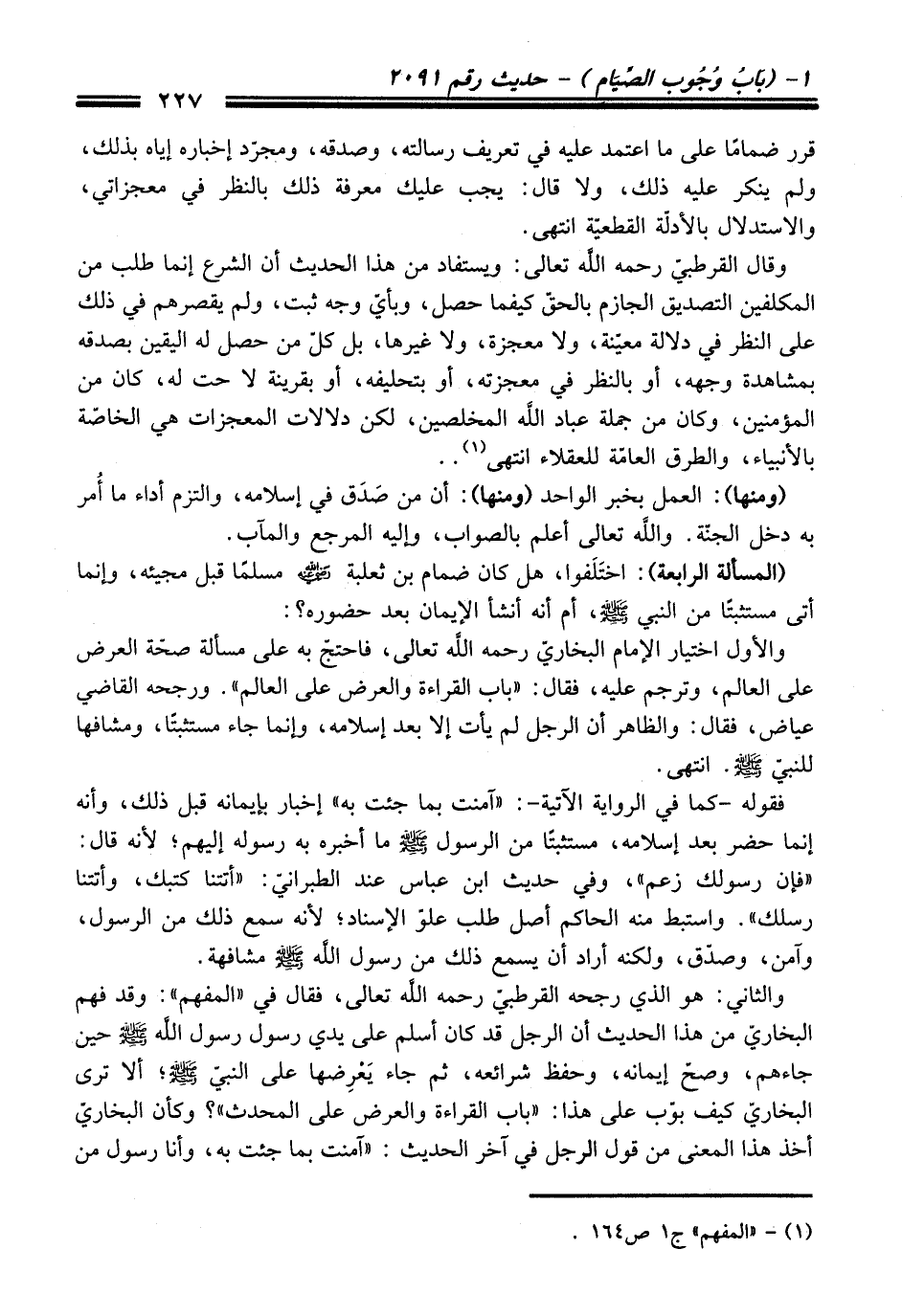 قرر ضمامًا على ما اعتمد عليه في تعريف رسالته، وصدقه، ومجرّد إخباره إياه بذلك، ولم ينكر عليه ذلك، ولا قال: يجب عليك معرفة ذلك بالنظر في معجزاتي، والاستدلال بالأدلّة القطعيّة انتهى.