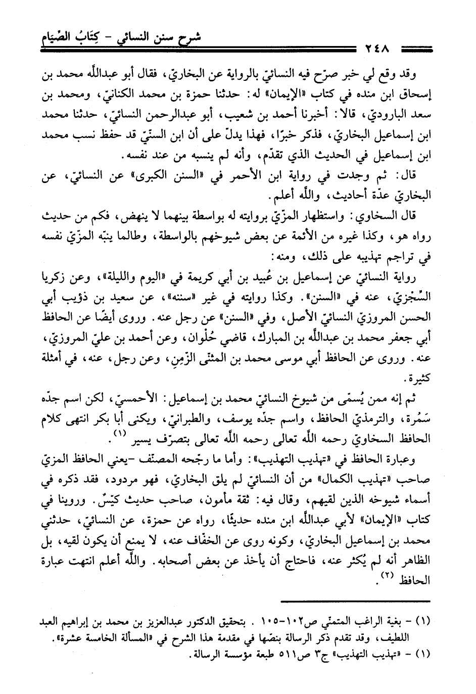 وعبارة الحافظ في "تهذيب التهذيب": وأما ما رجّحه المصنّف -يعني الحافظ المزيّ صاحب "تهذيب الكمال" من أن النسائيّ لم يلق البخاريّ، فهو مردود، فقد ذكره في أسماء شيوخه الذين لقيهم، وقال فيه: ثقة مأمون، صاحب حديث كيّسٌ. وروينا في كتاب "الإيمان" لأبي عبد اللَّه ابن منده حديثًا، رواه عن حمزة، عن النسائيّ، حدثني محمد بن إسماعيل البخاريّ، وكونه روى عن الخفّاف عنه، لا يمنع أن يكون لقيه، بل الظاهر أنه لم يُكثر عنه، فاحتاج أن ياخذ عن بعض أصحابه. واللَّه أعلم انتهت عبارة الحافظ (¬2).