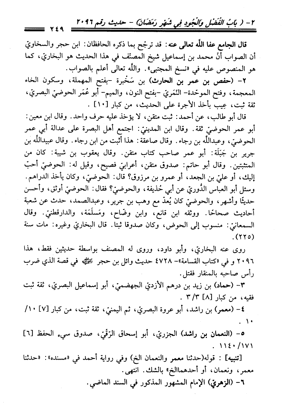 2 - (حفص بن عمر بن الحارث) بن سَخبرة -بفتح المهملة، وسكون الخاء المعجمة، وفتح الموحّدة- النّمَريّ -بفتح النون، والميم- أبو عُمَر الحوضيّ البصريّ، ثقة ثبت، عِيب بأخذ الأجرة على الحديث، من كبار [10].