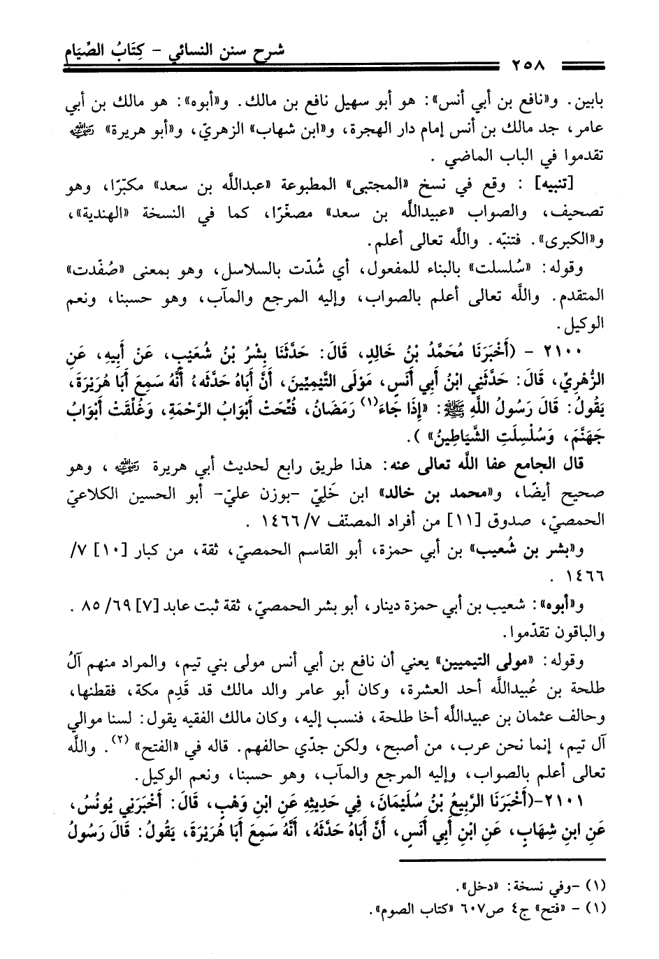 2100 - (أَخْبَرَنَا مُحَمَّدُ بْنُ خَالِدٍ, قَالَ: حَدَّثَنَا بِشْرُ بْنُ شُعَيْبٍ, عَنْ أَبِيهِ,, عَنِ الزُّهْرِيِّ,, قَالَ: حَدَّثَنِي ابْنُ أَبِي أَنَسٍ, مَوْلَى التَّيْمِيِّينَ, أَنَّ أَبَاهُ حَدَّثَهُ, أَنَّهُ سَمِعَ أَبَا هُرَيْرَةَ, يَقُولُ: قَالَ رَسُولُ اللَّهِ - صلى اللَّه عليه وسلم -: «إِذَا جَاءَ (¬1) رَمَضَانُ, فُتِّحَتْ أَبْوَابُ الرَّحْمَةِ, وَغُلِّقَتْ أَبْوَابُ جَهَنَّمَ, وَسُلْسِلَتِ الشَّيَاطِينُ»).