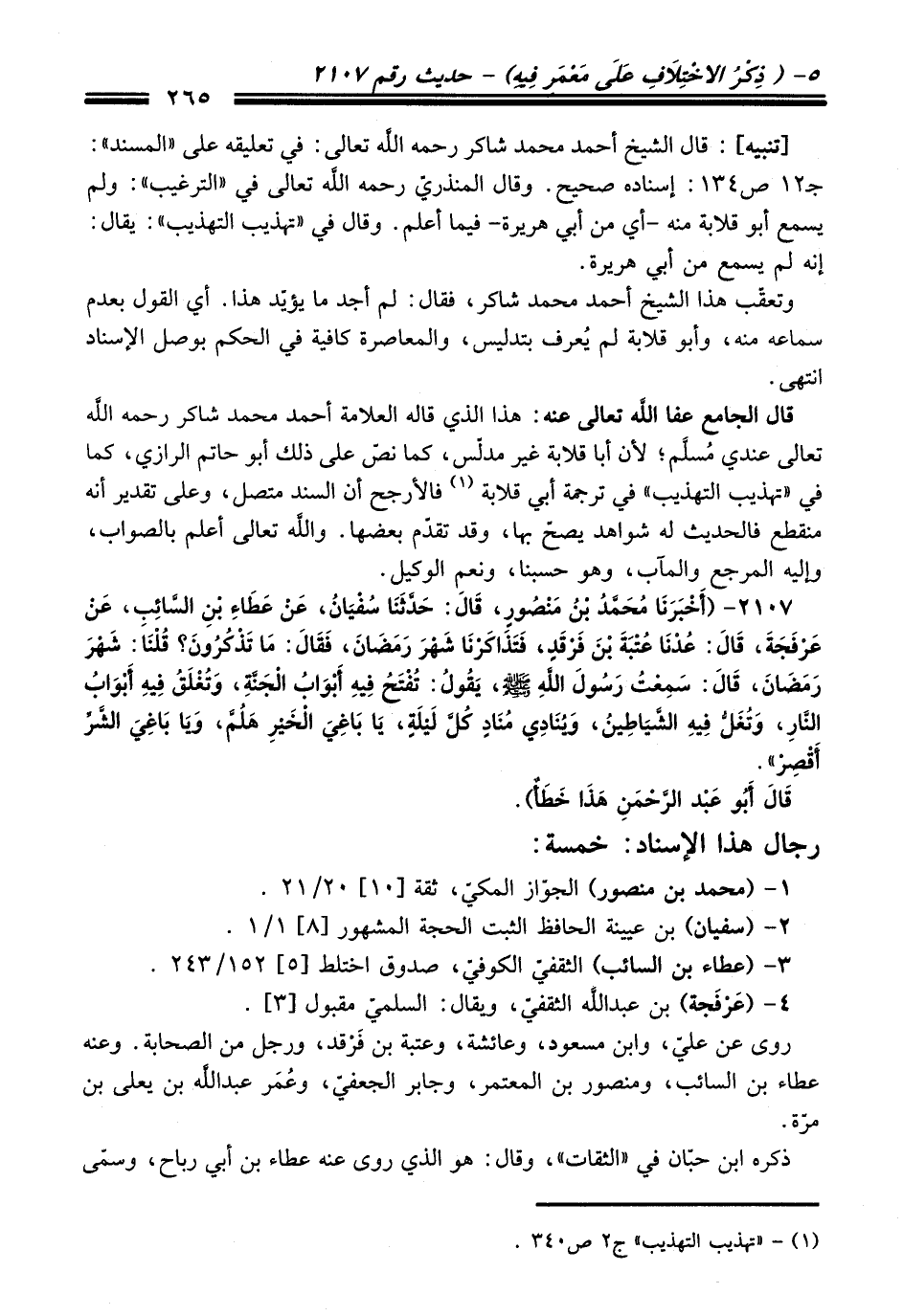 قال الجامع - عفا اللَّه تعالى عنه -: هذا الذي قاله العلامة أحمد محمد شاكر -رَحِمَهُ اللَّهُ تَعَالَى- عندي مُسلَّم؛ لأن أبا قلابة غير مدلّس، كما نصّ على ذلك أبو حاتم الرازي، كما في "تهذيب التهذيب" في ترجمة أبي قلابة (¬1) فالأرجح أن السند متصل، وعلى تقدير أنه منقطع فالحديث له شواهد يصحّ بها، وقد تقدّم بعضها. واللَّه تعالى أعلم بالصواب، وإليه المرجع والمآب، وهو حسبنا، ونعم الوكيل.