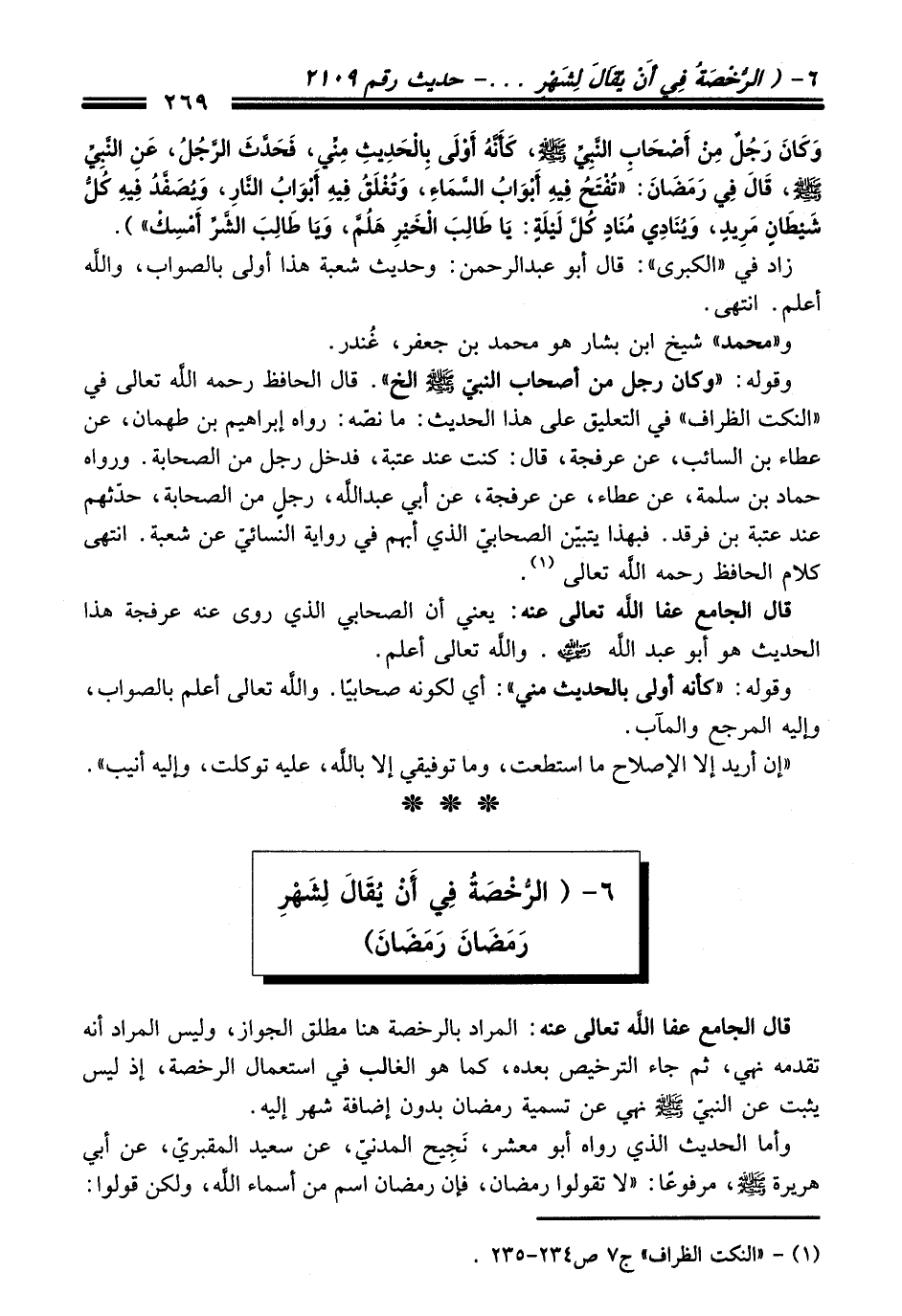 قال الجامع - عفا اللَّه تعالى عنه -: المراد بالرخصة هنا مطلق الجواز، وليس المراد أنه تقدمه نهي، ثم جاء الترخيص بعده، كما هو الغالب في استعمال الرخصة، إذ ليس يثبت عن النبي- صلى اللَّه عليه وسلم - صلى اللَّه عليه وسلم - نهي عن تسمية رمضان بدون إضافة شهر إليه.