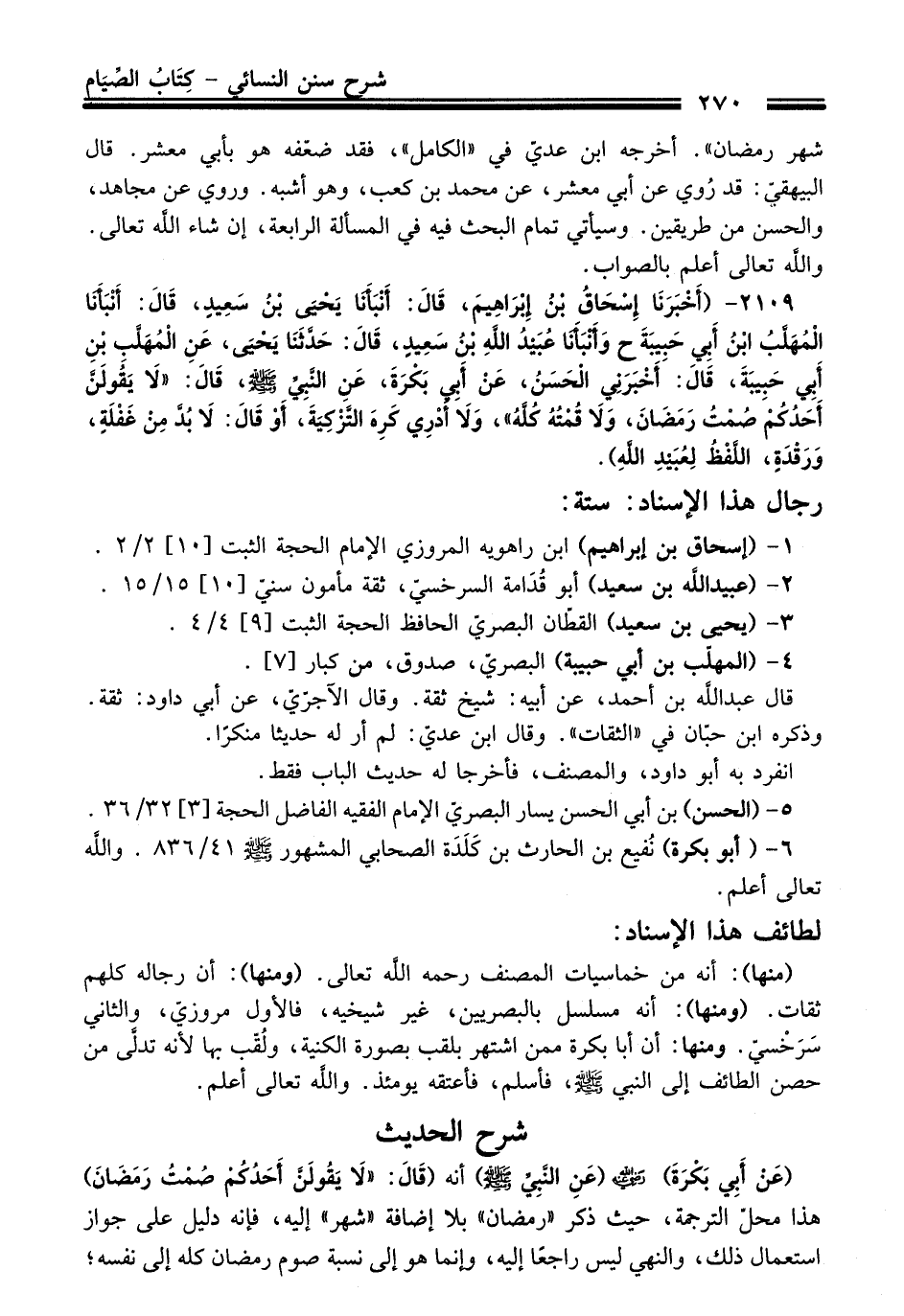 2109 - (أَخْبَرَنَا إِسْحَاقُ بْنُ إِبْرَاهِيمَ, قَالَ: أَنْبَأَنَا يَحْيَى بْنُ سَعِيدٍ, قَالَ: أَنْبَأَنَا الْمُهَلَّبُ بْنُ أَبِي حَبِيبَةَ ح وَأَنْبَأَنَا عُبَيْدُ اللَّهِ بْنُ سَعِيدٍ, قَالَ: حَدَّثَنَا يَحْيَى, عَنِ الْمُهَلَّبِ بْنِ أَبِي حَبِيبَةَ, قَالَ: أَخْبَرَنِي الْحَسَنُ, عَنْ أَبِي بَكْرَةَ, عَنِ النَّبِيِّ - صلى اللَّه عليه وسلم -, قَالَ: «لاَ يَقُولَنَّ أَحَدُكُمْ صُمْتُ رَمَضَانَ, وَلاَ قُمْتُهُ كُلَّهُ» , وَلاَ أَدْرِي كَرِهَ التَّزْكِيَةَ, أَوْ قَالَ: لاَ بُدَّ مِنْ غَفْلَةٍ, وَرَقْدَةٍ, اللَّفْظُ لِعُبَيْدِ اللَّهِ).