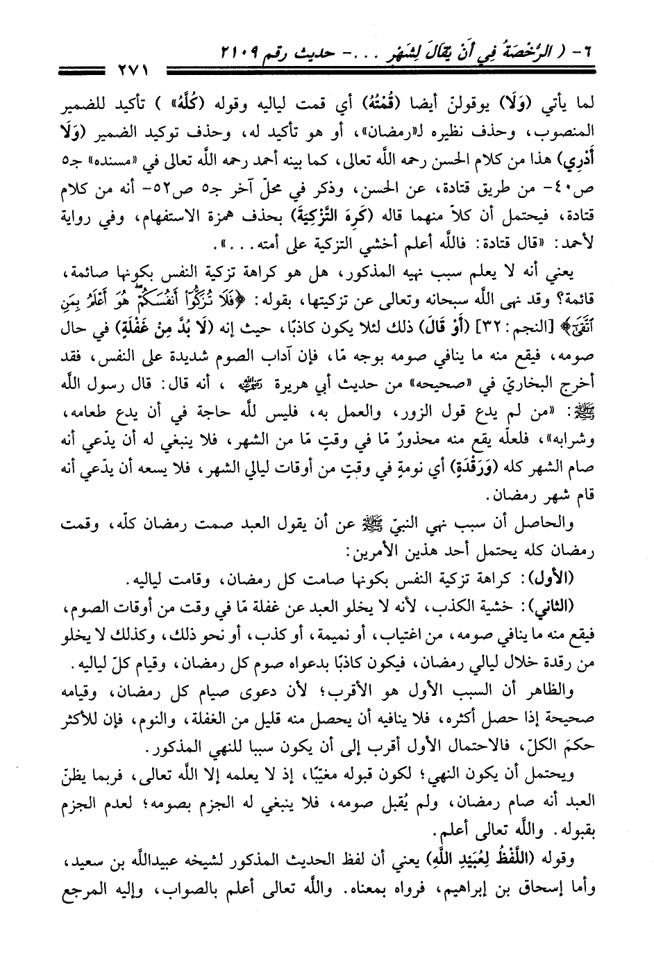 والحاصل أن سبب نهي النبيّ - صلى اللَّه عليه وسلم -عن أن يقول العبد صمت رمضان كلّه، وقمت رمضان كله يحتمل أحد هذين الأمرين: