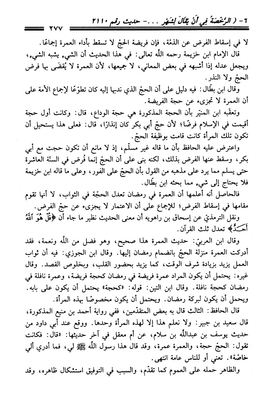 قال الإمام ابن خزيمة -رحمه اللَّه تعالى-: في هذا الحديث أن الشيء يشبه الشيء، ويجعل عدله إذا أشبهه في بعض المعاني، لا جميعها، لأنّ العمرة لا يُقضَى بها فرض الحجّ ولا النذر.