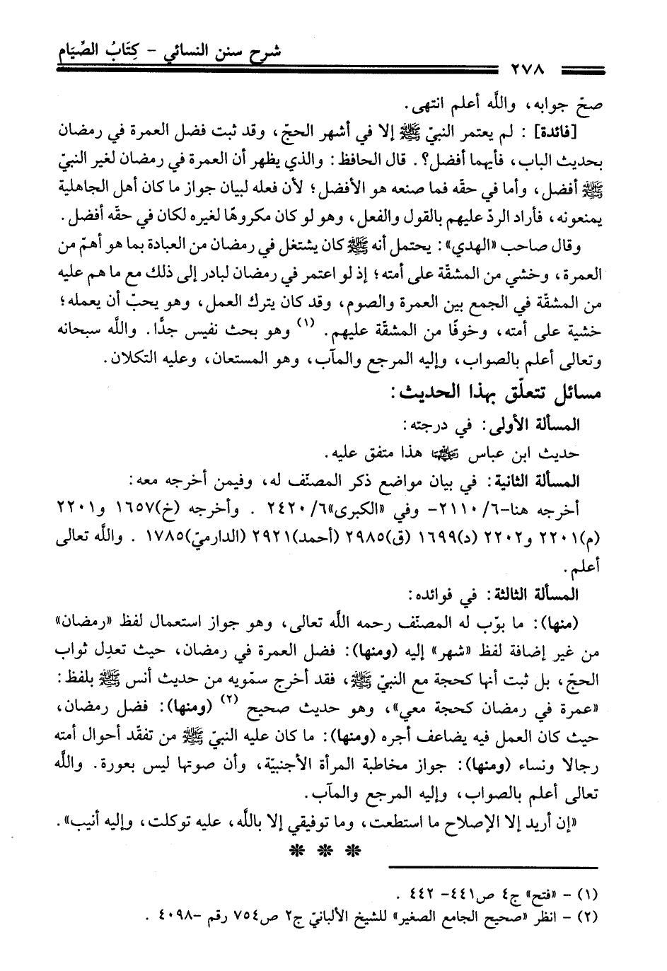 وقال صاحب "الهدي": يحتمل أنه - صلى اللَّه عليه وسلم - كان يشتغل في رمضان من العبادة بما هو أهمّ من العمرة، وخشي من المشقّة على أمته؛ إذ لو اعتمر في رمضان لبادر إلى ذلك مع ما هم عليه من المشقّة في الجمع بين العمرة والصوم، وقد كان يترك العمل، وهو يحبّ أن يعمله؛ خشية على أمته، وخوفًا من المشقّة عليهم. (¬1) وهو بحث نفيس جدًّا. واللَّه سبحانه وتعالى أعلم بالصواب، وإليه المرجع والمآب، وهو المستعان، وعليه التكلان.