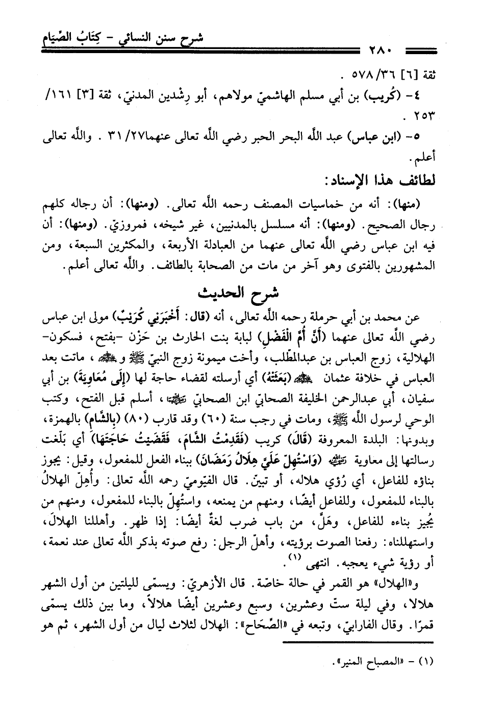 عن محمد بن أبي حرملة -رحمه اللَّه تعالى-، أنه (قال: أَخبَرَنِي كُرَيْبٌ) مولى ابن عباس - رضي اللَّه تعالى عنهما - (أَنَّ أُمَّ الْفَضْلِ) لبابة بنت الحارث بن حَزْن -بفتح، فسكون- الهلالية، زوج العباس بن عبد المطّلب، وأخت ميمونة زوج النبيّ - صلى اللَّه عليه وسلم - و- رضي اللَّه عنه -، ماتت بعد العباس في خلافة عثمان - رضي اللَّه عنه - (بَعَثَتْهُ) أي أرسلته لقضاء حاجة لها (إِلَى مُعَاوِيَةَ) بن أبي سفيان، أبي عبد الرحمن الخليفة الصحابيّ ابن الصحابيّ - رضي اللَّه عنهما -، أسلم قبل الفتح، وكتب الوحي لرسول اللَّه - صلى اللَّه عليه وسلم -، ومات في رجب سنة (60) وقد قارب (80) (بِالشّامِ) بالهمزة، وبدونها: البلدة المعروفة (قَالَ) كريب (فَقَدِمْتُ الشَّامَ، فَقَضَيْتُ حَاجَتَهَا) أي بَلّغت رسالتها إلى معاوية - رضي اللَّه عنه - (وَاسْتُهِلّ عَلَيَّ هِلَالُ رَمَضَانَ) ببناء الفعل للمفعول، وقيل: يجوز بناؤه للفاعل، أي رُؤي هلاله، أو تبيّن. قال الفيّوميّ -رحمه اللَّه تعالى-: وأُهِلّ الهلالُ بالبناء للمفعول، وللفاعل أيضًا، ومنهم من يمنعه، واستُهِلّ بالبناء للمفعول، ومنهم من يجُيز بناءه للفاعل، وهَل، من باب ضرب لغةٌ أيضًا: إذا ظهر. وأهللنا الهلالَ، واستهللناه: رفعنا الصوت برؤيته، وأهل الرجل: رفع صوته بذكر اللَّه تعالى عند نعمة، أو رؤية شيء يعجبه. انتهى (¬1).