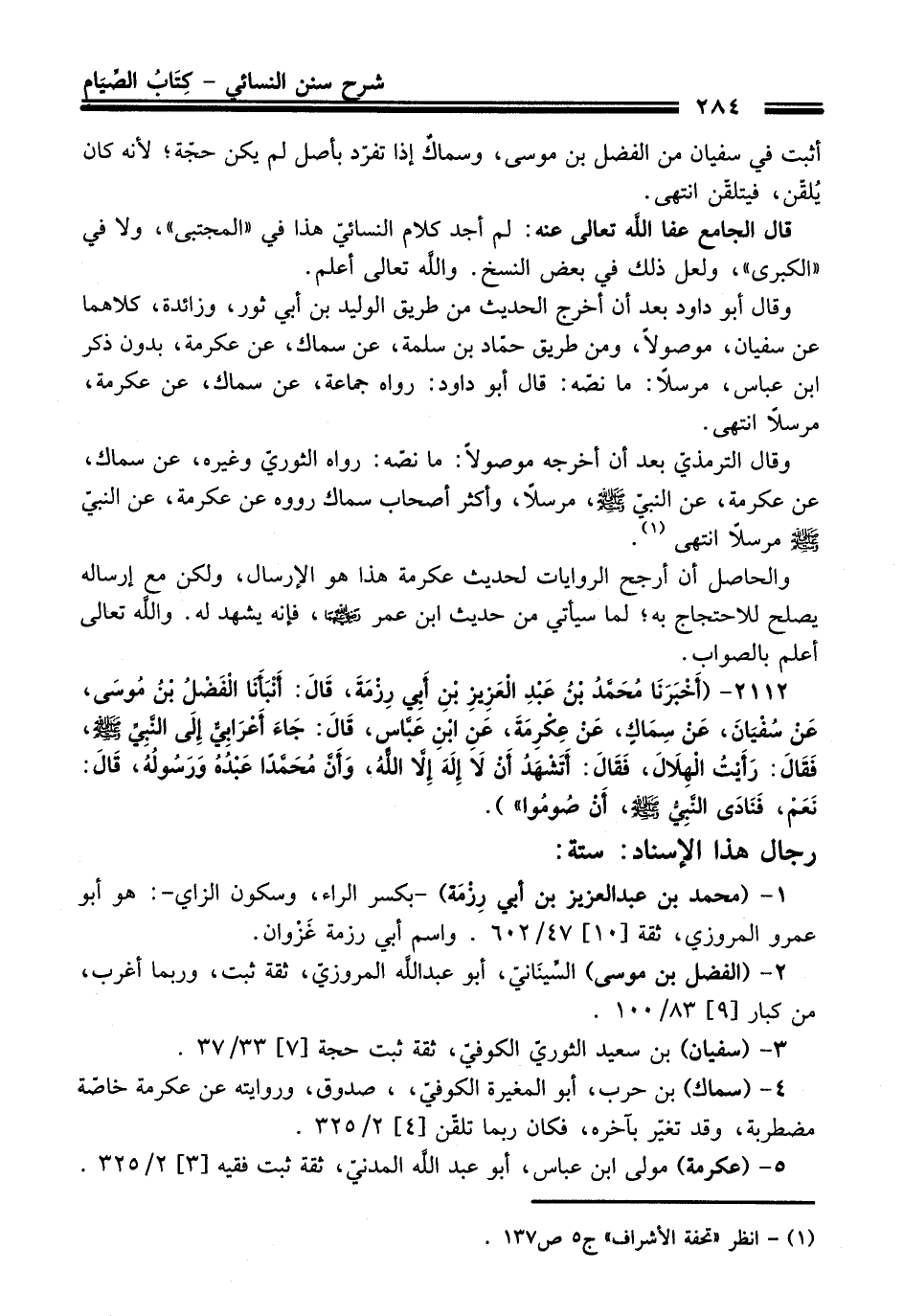 2112 - (أَخْبَرَنَا مُحَمَّدُ بْنُ عَبْدِ الْعَزِيزِ بْنِ أَبِي رِزْمَةَ, قَالَ: أَنْبَأَنَا الْفَضْلُ بْنُ مُوسَى, عَنْ سُفْيَانَ, عَنْ سِمَاكٍ, عَنْ عِكْرِمَةَ, عَنِ ابْنِ عَبَّاسٍ, قَالَ: جَاءَ أَعْرَابِيٌّ إِلَى النَّبِيِّ - صلى اللَّه عليه وسلم -, فَقَالَ: رَأَيْتُ الْهِلاَلَ, فَقَالَ: «أَتَشْهَدُ أَنْ لاَ إِلَهَ إِلاَّ اللَّهُ, وَأَنَّ مُحَمَّدًا عَبْدُهُ وَرَسُولُهُ, قَالَ: نَعَمْ, فَنَادَى النَّبِيُّ - صلى اللَّه عليه وسلم -, أَنْ صُومُوا»).