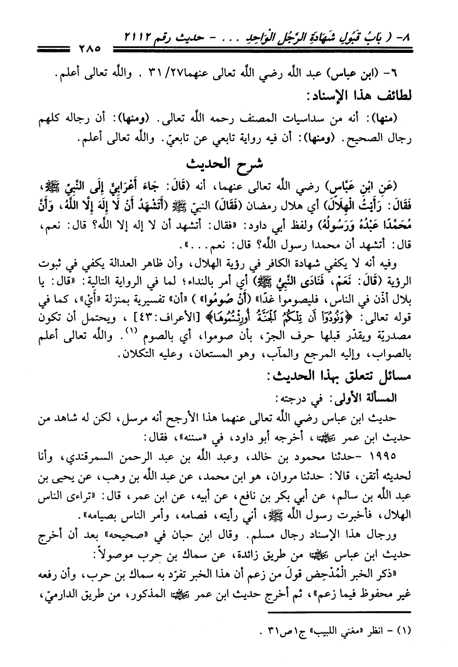 (عَنِ ابْنِ عَبَّاسٍ) - رضي اللَّه تعالى عنهما -، أنه (قَالَ: جَاءَ أَعْرَابِيٌّ إِلَى النَّبِيِّ - صلى اللَّه عليه وسلم -، فَقَالَ: رَأَيْتُ الْهِلَالَ) أي هلال رمضان (فَقَالَ) النبيّ - صلى اللَّه عليه وسلم - (أَتَشْهَدُ أَنْ لَا إِلَهَ إِلا الَلهُ، وَأَنَّ مُحَمَّدًا عَبْدُهُ وَرَسُولُهُ) ولفظ أبي داود: "فقال: أتشهد أن لا إله إلا اللَّه؟ قال: نعم، قال: أتشهد أن محمدا رسول اللَّه؟ قال: نعم ... ".