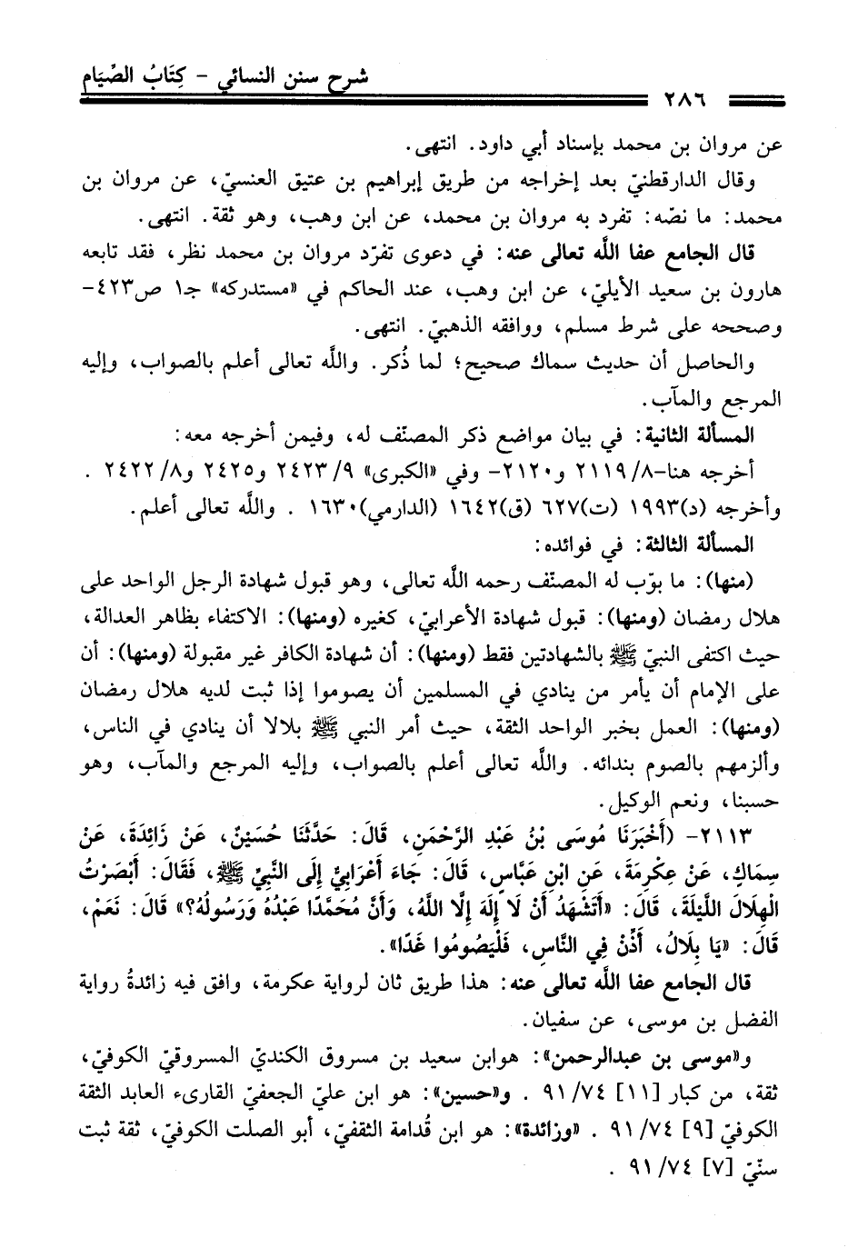 2113 - (أَخْبَرَنَا مُوسَى بْنُ عَبْدِ الرَّحْمَنِ, قَالَ: حَدَّثَنَا حُسَيْنٌ, عَنْ زَائِدَةَ, عَنْ سِمَاكٍ, عَنْ عِكْرِمَةَ, عَنِ ابْنِ عَبَّاسٍ, قَالَ: جَاءَ أَعْرَابِيٌّ إِلَى النَّبِيِّ - صلى اللَّه عليه وسلم -, فَقَالَ: أَبْصَرْتُ الْهِلاَلَ اللَّيْلَةَ, قَالَ: «أَتَشْهَدُ أَنْ لاَ إِلَهَ إِلاَّ اللَّهُ, وَأَنَّ مُحَمَّدًا عَبْدُهُ وَرَسُولُهُ؟» قَالَ: نَعَمْ, قَالَ: «يَا بِلاَلُ, أَذِّنْ فِي النَّاسِ, فَلْيَصُومُوا غَدًا».