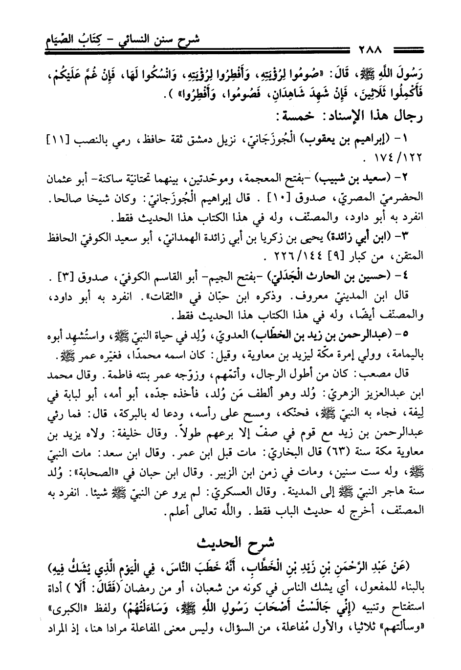 (عَنْ عَبْدِ الرَّحْمَن بْنِ زَيْدِ بْنِ الْخَطَّابِ، أنَّهُ خَطَبَ النَّاسَ، فِي الْيَوْمِ الّذِي يُشَكُّ فِيهِ) بالبناء للمفعول، أي يشك الناس في كوَنه من شعبان، أو من رمضان (فَقَالَ: أَلَا) أداة استفتاح وتنبيه (إِنِّي جَالَسْتُ أَصْحَابَ رَسُولِ اللَّهِ - صلى اللَّه عليه وسلم -، وسَاءَلْتُهُم) ولفظ "الكبرى" "وسألتهم" ثلاثيا، والأول مُفاعلة، من السؤال، وليس معنى المفاعلة مرادا هنا، إذ المراد