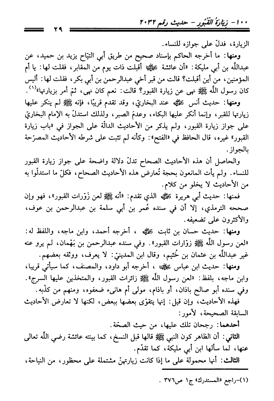 والحاصل أن هذه الأحاديث الصحاح تدلّ دلالة واضحة على جواز زيارة القبور للنساء. ولم يأت المانعون بحجة تُعارض هذه الأحاديث الصحاح، فكلّ ما استدلّوا به من الأحاديث لا يخلو من كلام.