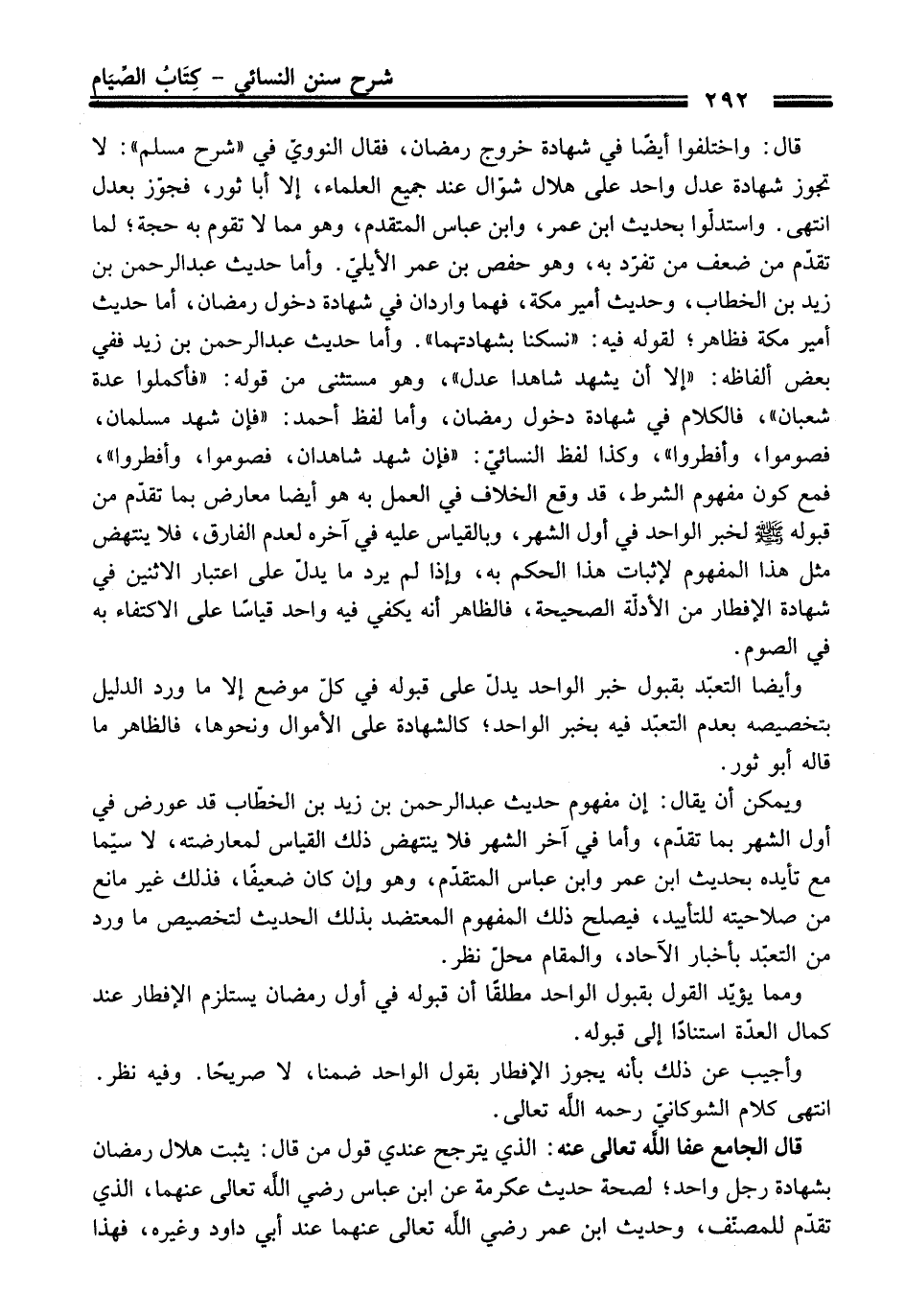 قال الجامع - عفا اللَّه تعالى عنه -: الذي يترجح عندي قول من قال: يثبت هلال رمضان بشهادة رجل واحد؛ لصحة حديث عكرمة عن ابن عباس - رضي اللَّه تعالى عنهما -، الذي تقدّم للمصنّف، وحديث ابن عمر - رضي اللَّه تعالى عنهما - عند أبي داود وغيره، فهذا