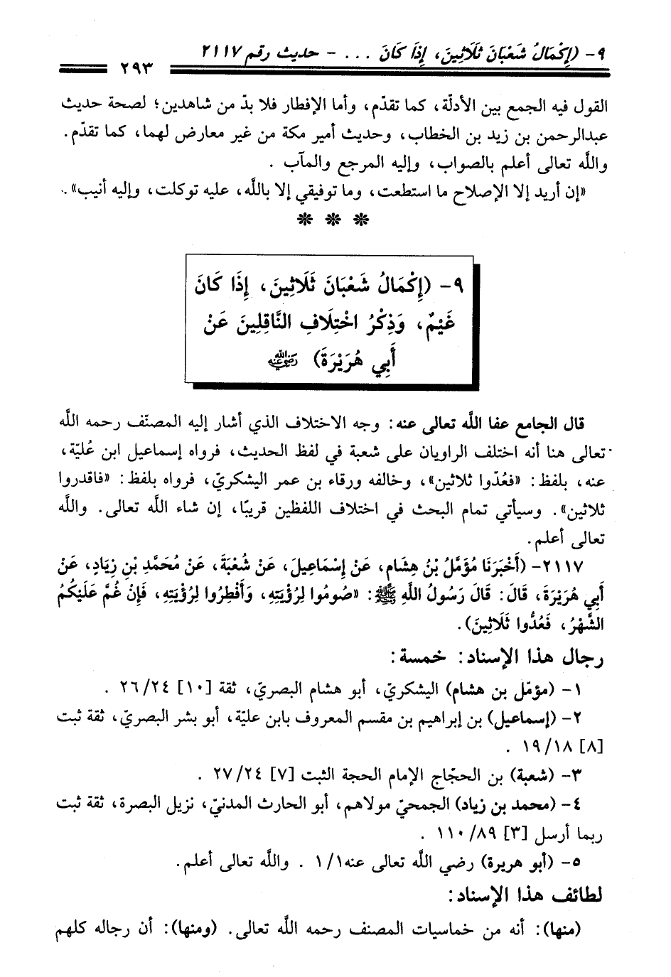 2117 - (أَخْبَرَنَا مُؤَمَّلُ بْنُ هِشَامٍ, عَنْ إِسْمَاعِيلَ, عَنْ شُعْبَةَ, عَنْ مُحَمَّدِ بْنِ زِيَادٍ, عَنْ أَبِي هُرَيْرَةَ, قَالَ: قَالَ رَسُولُ اللَّهِ - صلى اللَّه عليه وسلم -: «صُومُوا لِرُؤْيَتِهِ, وَأَفْطِرُوا لِرُؤْيَتِهِ, فَإِنْ غُمَّ عَلَيْكُمُ الشَّهْرُ, فَعُدُّوا ثَلاَثِينَ»).