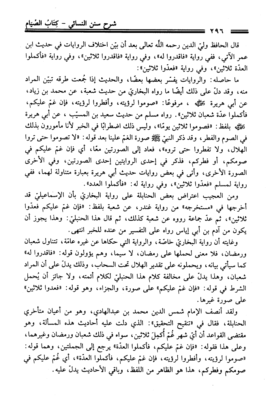 ولقد أنصف الإمام شمس الدين محمد بن عبد الهادي، وهو من أعيان متأخري الحنابلة، فقال في "تنقيح التحقيق": الذي دلت عليه أحاديث هذه المسألة، وهو مقتضى القواعد أن أيّ شهر غُمّ أُكمِلَ ثلاثين، سواء في ذلك شعبان ورمضان وغيرهما، وعلى هذا فقوله: "فإن غمّ عليكم، فأكملوا العدّة" يرجع إلى الجملتين، وهما قوله: "صوموا لرؤيته، وأفطروا لرؤيته، فإن غمّ عليكم، فأكملوا العدّة"، أي غُمّ عليكم في صومكم وفطركم، هذا هو الظاهر من اللفظ، وباقي الأحاديث يدلّ عليه.