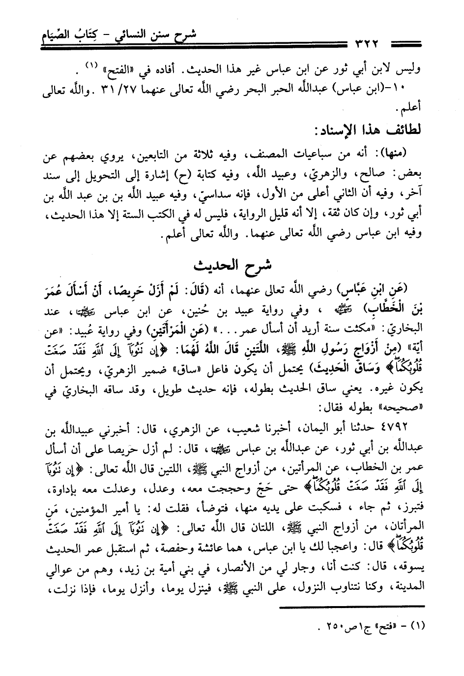 4792 حدثنا أبو اليمان، أخبرنا شعيب، عن الزهري، قال: أخبرني عبيد اللَّه بن عبد اللَّه بن أبي ثور، عن عبد اللَّه بن عباس - رضي اللَّه عنه -، قال: لم أزل حريصا على أن أسأل عمر بن الخطاب، عن المرأتين، من أزواج النبي - صلى اللَّه عليه وسلم -، اللتين قال اللَّه تعالى: {إِنْ تَتُوبَا إِلَى اللَّهِ فَقَدْ صَغَتْ قُلُوبُكُمَا} حتى حَجّ وحججت معه، وعدل، وعدلت معه بإداوة، فتبرز، ثم جاء، فسكبت على يديه منها، فتوضأ، فقلت له: يا أمير المؤمنين، مَنِ المرأتان، من أزواج النبي - صلى اللَّه عليه وسلم -، اللتان قال اللَّه تعالى: {إِنْ تَتُوبَا إِلَى اللَّهِ فَقَدْ صَغَتْ قُلُوبُكُمَا} قال: واعجبا لك يا ابن عباس، هما عائشة وحفصة، ثم استقبل عمر الحديث يسوقه، قال: كنت أنا، وجار لي من الأنصار، في بني أمية بن زيد، وهم من عوالي المدينة، وكنا نتناوب النزول، على النبي - صلى اللَّه عليه وسلم -، فينزل يوما، وأنزل يوما، فإذا نزلت،