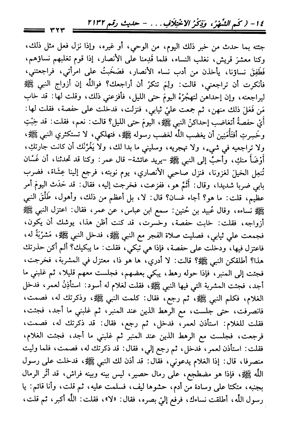 جئته بما حدث من خبر ذلك اليوم، من الوحي، أو غيره، وإذا نزل فعل مثل ذلك، وكنا معشرَ قريش، نغلب النساء، فلما قَدِمنا على الأنصار، إذا قوم تغلبهم نساؤهم، فَطَفِقَ نساؤنا، يأخذن من أدب نساء الأنصار، فصَخَبتُ على امرأتي، فراجعتني، فأنكرت أن تراجعني، قالت: ولِمَ تنكرُ أن أراجعك؟ فواللَّه إن أزواج النبي - صلى اللَّه عليه وسلم - ليراجعنه، وإن إحداهن لتهجُرُهُ اليومَ حتى الليل، فأفزعني ذلك، وقلت لها: قد خاب مَن فَعَلَ ذلك منهن، ثم جمعت عليّ ثيابي، فنزلت، فدخلت على حفصة، فقلت لها: أَيْ حفصةُ أتغاضب إحداكنّ النبي - صلى اللَّه عليه وسلم -، اليومَ حتى الليل؟ قالت: نعم، فقلت: قد خِبْتِ وخَسِرتِ أفتَأْمَنِين أن يغضب اللَّه لغضب رسوله - صلى اللَّه عليه وسلم -، فتهلكي، لا تستكثري النبي - صلى اللَّه عليه وسلم -، ولا تراجعيه في شيء، ولا تهجريه، وسليني ما بدا لك، ولا يَغُرَّنّك أن كانت جارتكِ، أَوْضَأَ منكِ، وأحبَّ إلى النبي - صلى اللَّه عليه وسلم -يريد عائشة- قال عمر: وكنا قد تحدثنا، أن غَسَّان تُنعِل الخيلَ لغزونا، فنزل صاحبي الأنصاري، يوم نوبته، فرجع إلينا عِشَاءً، فضرب بأبي ضربا شديدا، وقال: أَثَمَّ هو، ففزعت، فخرجت إليه، فقال: قد حَدَث اليومَ أمر عظيم، قلت: ما هو؟ أجاء غسان؟ قال: لا، بل أعظم من ذلك، وأهول، طَلَّقَ النبي - صلى اللَّه عليه وسلم - نساءه، وقال عُبيد بن حُنين: سمع ابن عباس، عن عمر، فقال: اعتزل النبي - صلى اللَّه عليه وسلم - أزواجه، فقلت: خابت حفصة، وخسرت، قد كنت أظن هذا، يوشك أن يكون، فجمعت علي ثيابي، فصليت صلاة الفجر مع النبي - صلى اللَّه عليه وسلم -، فدخل النبي - صلى اللَّه عليه وسلم -، مَشرُبَةً له، فاعتزل فيها، ودخلت على حفصة، فإذا هي تبكي، فقلت: ما يبكيك؟ ألم أكن حذرتك هذا؟ أطلقكن النبي - صلى اللَّه عليه وسلم -؟؛ قالت: لا أدري، ها هو ذا، معتزل في المشربة، فخرجت، فجئت إلى المنبر، فإذا حوله رهط، يبكي بعضهم، فجلست معهم قليلا، ثم غلبني ما أجد، فجئت المشربة التي فيها النبي - صلى اللَّه عليه وسلم -، فقلت لغلام له أسود: استأذِنْ لعمر، فدخل الغلام، فكلم النبي - صلى اللَّه عليه وسلم -، ثم رجع، فقال: كلمت النبي - صلى اللَّه عليه وسلم -، وذكرتك له، فصمت، فانصرفت، حتى جلست، مع الرهط الذين عند المنبر، ثم غلبني ما أجد، فجئت، فقلت للغلام: استأذن لعمر، فدخل، ثم رجع، فقال: قد ذكرتك له، فصمت، فرجعت، فجلست مع الرهط الذين عند المنبر ثم غلبني ما أجد، فجئت الغلام، فقلت: استأذن لعمر، فدخل، ثم رجع إلي، فقال: قد ذكرتك له، فصمت، فلما وليت منصرفا، قال: إذا الغلام يدعوني، فقال: قد أذن لك النبي - صلى اللَّه عليه وسلم -، فدخلت على رسول اللَّه - صلى اللَّه عليه وسلم - فإذا هو مضطجع، على رمال حصير، ليس بينه وبينه فراش، قد أثّر الرمال بجنبه، متكئا على وسادة من أدم، حشوها ليف، فسلمت عليه، ثم قلت، وأنا قائم: يا رسول اللَّه، أطلقت نساءك، فرفع إليّ بصره، فقال: "لا"، فقلت: اللَّه أكبر، ثم قلت،