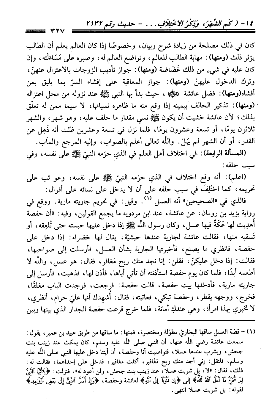 (¬1) - قصة العسل ساقها البخاريّ مطوّلة ومختصرة، فمنها: ما ساقها من طريق عبيد بن عمير، يقول: سمعت عائشة - رضي اللَّه عنها -، أن النبي - صلى اللَّه عليه وسلم - صلى اللَّه عليه وسلم، كان يمكث عند زينب بنت جحش، ويشرب عندها عسلا، فتواصيت أنا وحفصة، أن أيتنا دخل عليها النبيّ - صلى اللَّه عليه وسلم -، فلتقل: إني أجد منك ريح مَغَافير، أكلت مغافير، فدخل على إحداهما، فقالت له: ذلك، فقال: "لا" بل شربت عسلا، عند زينب بنت جحش، ولن أعود له"، فنزلت: {يَا أَيُّهَا النَّبِيُّ لِمَ تُحَرِّمُ مَا أَحَلَّ اللَّهُ لَكَ} إلي {إِنْ تَتُوبَا إِلَى اللَّهِ} لعائشة وحفصة، {وَإِذْ أَسَرَّ النَّبِيُّ إِلَى بَعْضِ أَزْوَاجِهِ} لقوله: بل شربت عسلا انتهى.