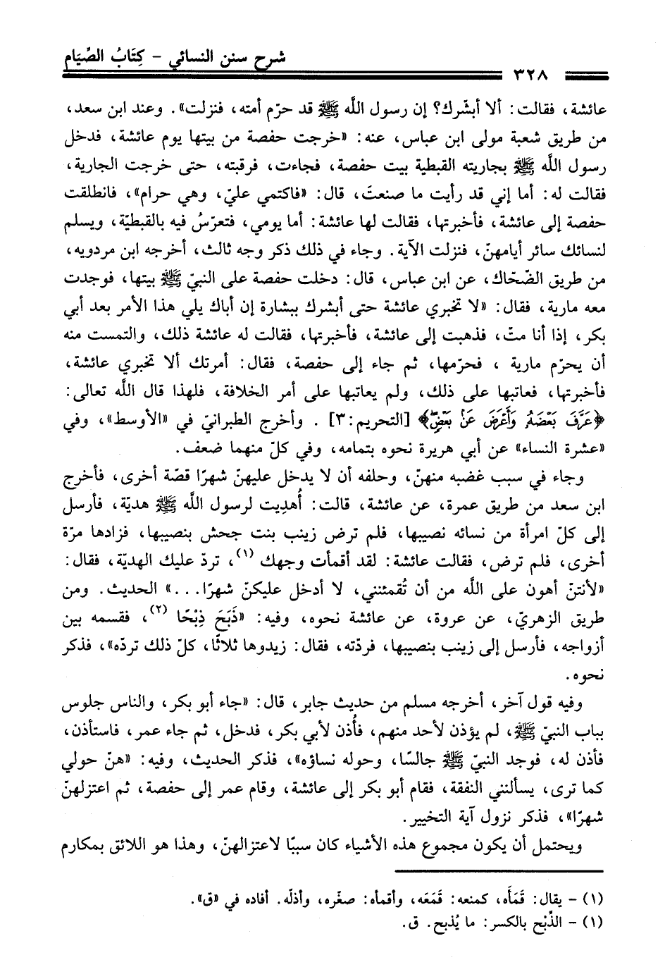 عائشة، فقالت: ألا أبشّرك؟ إن رسول اللَّه - صلى اللَّه عليه وسلم - قد حرّم أمته، فنزلت". وعند ابن سعد، من طريق شعبة مولى ابن عباس، عنه: "خرجت حفصة من بيتها يوم عائشة، فدخل رسول اللَّه - صلى اللَّه عليه وسلم - بجاريته القبطية بيت حفصة، فجاءت، فرقبته، حتى خرجت الجارية، فقالت له: أما إني قد رأيت ما صنعتَ، قال: "فاكتمي عليّ، وهي حرام"، فانطلقت حفصة إلى عائشة، فأخبرتها، فقالت لها عائشة: أما يومي، فتعرَسُ فيه بالقبطيّة، ويسلم لنسائك سائر أيامهنّ، فنزلت الآية. وجاء في ذلك ذكر وجه ثالث، أخرجه ابن مردويه، من طريق الضحّاك، عن ابن عباس، قال: دخلت حفصة على النبيّ - صلى اللَّه عليه وسلم - بيتها، فوجدت معه مارية، فقال: "لا تخبري عائشة حتى أبشرك ببشارة إن أباك يلي هذا الأمر بعد أبي بكر، إذا أنا متّ، فذهبت إلى عائشة، فاخبرتها، فقالت له عائشة ذلك، والتمست منه أن يحرّم مارية، فحرّمها، ثم جاء إلى حفصة، فقال: أمرتك ألا تخبري عائشة، فأخبرتها، فعاتبها على ذلك، ولم يعاتبها على أمر الخلافة، فلهذا قال اللَّه تعالى: {عَرَّفَ بَعْضَهُ وَأَعْرَضَ عَنْ بَعْضٍ}. وأخرج الطبرانيّ في "الأوسط"، وفي "عشرة النساء" عن أبي هريرة نحوه بتمامه، وفي كلّ منهما ضعف.