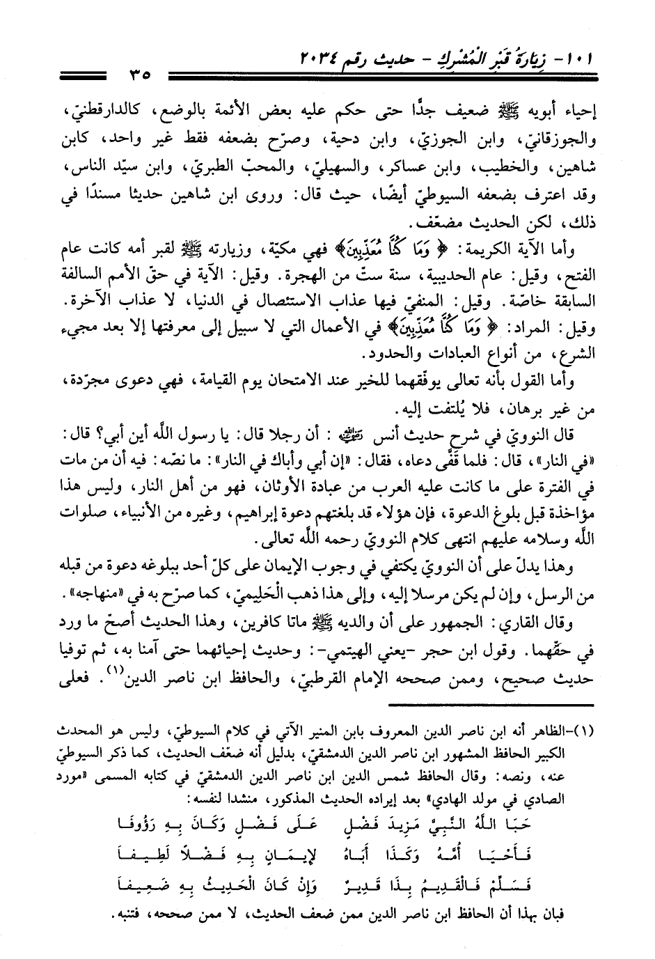 وقال القاري: الجمهور على أن والديه - صلى اللَّه عليه وسلم - ماتا كافرين، وهذا الحديث أصحّ ما ورد في حَقِّهما. وقول ابن حجر -يعني الهيتمي-: وحديث إحيائهما حتى آمنا به، ثم توفيا حديث صحيح، وممن صححه الإمام القرطبيّ، والحافظ ابن ناصر الدين (¬1). فعلى