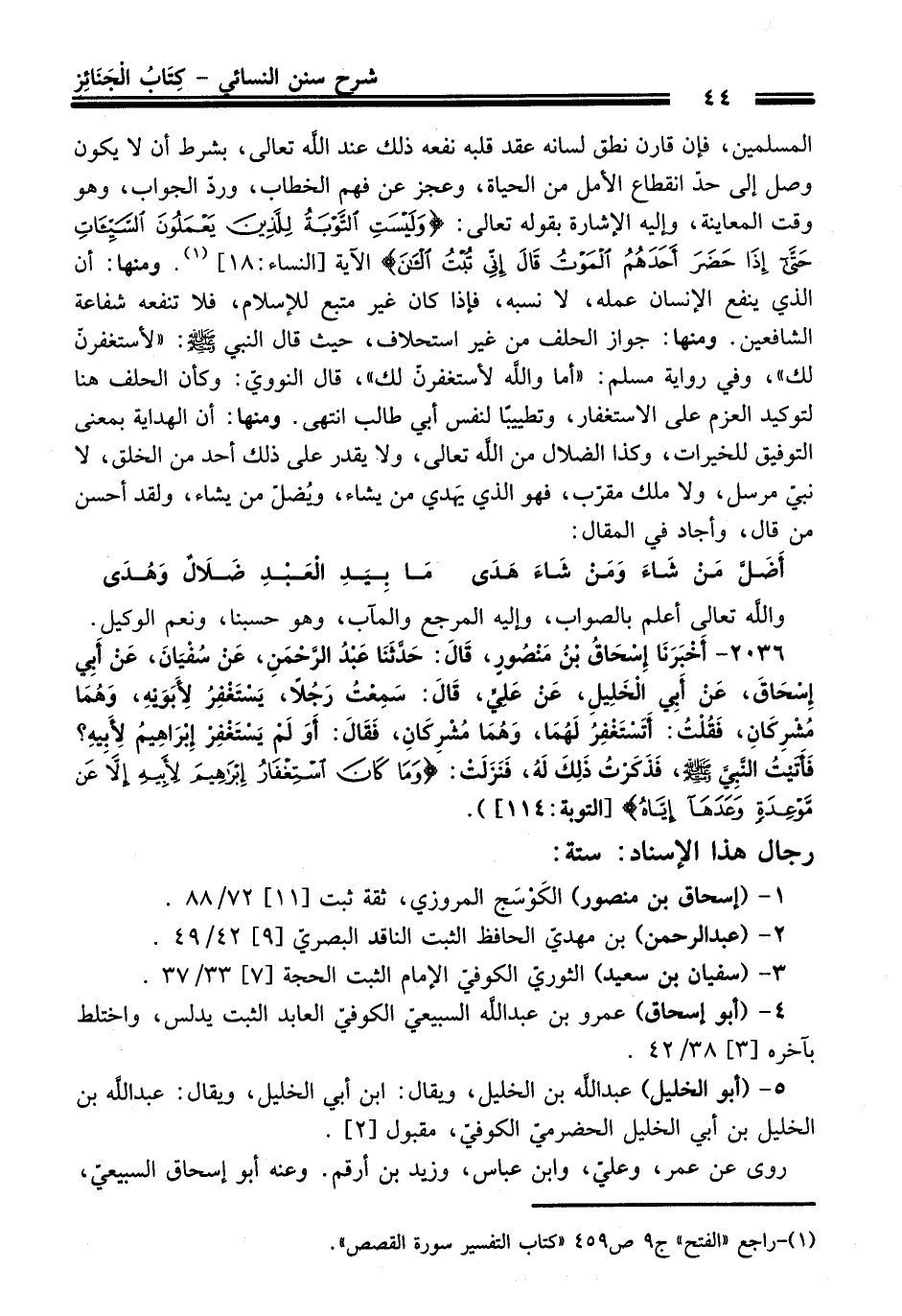 2036 - أَخْبَرَنَا إِسْحَاقُ بْنُ مَنْصُورٍ, قَالَ: حَدَّثَنَا عَبْدُ الرَّحْمَنِ, عَنْ سُفْيَانَ, عَنْ أَبِي إِسْحَاقَ, عَنْ أَبِي الْخَلِيلِ, عَنْ عَلِيٍّ, قَالَ: سَمِعْتُ رَجُلاً, يَسْتَغْفِرُ لأَبَوَيْهِ, وَهُمَا مُشْرِكَانِ, فَقُلْتُ: أَتَسْتَغْفِرُ لَهُمَا, وَهُمَا مُشْرِكَانِ, فَقَالَ: أَوَلَمْ يَسْتَغْفِرْ إِبْرَاهِيمُ لأَبِيهِ؟ فَأَتَيْتُ النَّبِيَّ - صلى اللَّه عليه وسلم -, فَذَكَرْتُ ذَلِكَ لَهُ, فَنَزَلَتْ: {وَمَا كَانَ اسْتِغْفَارُ إِبْرَاهِيمَ لِأَبِيهِ إِلَّا عَنْ مَوْعِدَةٍ وَعَدَهَا إِيَّاهُ} [التوبة: 114]).