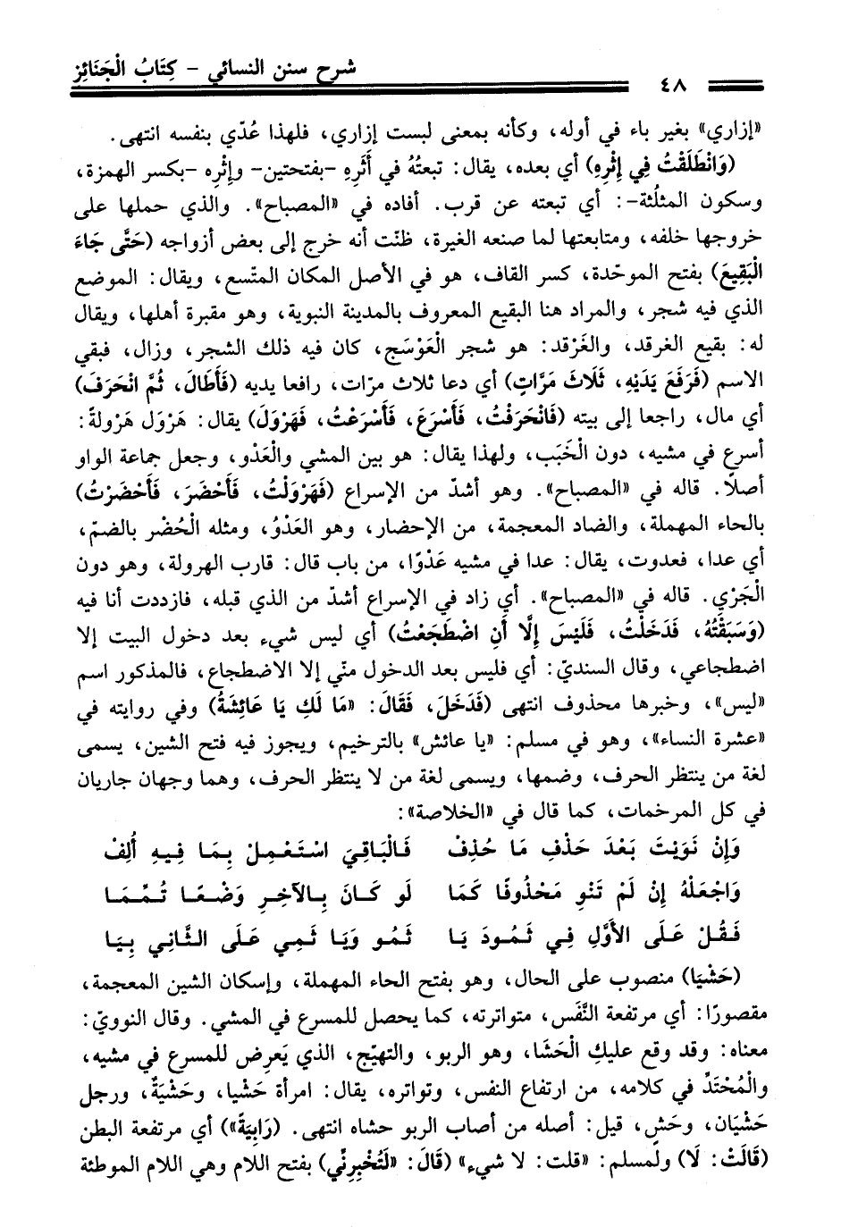 (وَانْطَلَقْتُ فِي إِثْرِهِ) أي بعده، يقال: تبعتُهُ في أثَرِهِ -بفتحتين- وِإثْرِه -بكسر الهمزة، وسكون المثلُثة-: أي تبعته عن قرب. أفاده في "المصباح". والذي حملها على خروجها خلفه، ومتابعتها لما صنعه الغيرة، ظنّت أنه خرج إلى بعض أزواجه (حَتَّى جَاءَ الْبَقِيعَ) بفتح الموحّدة، كسر القاف، هو في الأصل المكان المتّسع، ويقال: الموضع الذي فيه شجر، والمراد هنا البقيع المعروف بالمدينة النبوية، وهو مقبرة أهلها، ويقال له: بقيعِ الغرقد، والغَرْقد: هو شجر الْعَوْسَج، كان فيه ذلك الشجر، وزال، فبقي الاسم (فرَفَعَ يَدَيْهِ، ثَلَاثَ مَرَّاتِ) أي دعا ثلاث مرّات، رافعا يديه (فَأَطَالَ، ثُمَّ انْحَرَتَ) أي مال، راجعا إلى بيته (فَانْحَرَفْتُ، فَأَسْرَعَ، فَأَسْرَعْتُ، فَهَرْوَلَ) يقال: هَرْوَل هَرْولةً: أسرع في مشيه، دون الْخَبَب، ولهذا يقال: هو بين المشي والْعَدْو، وجعل جماعة الواو أصلًا. قاله في "المصباح". وهو أشدّ من الإسراع (فَهَرْوَلْتُ، فَأَحْضَرَ، فَأَحْضَرْتُ) بالحاء المهملة، والضاد المعجمة، من الإحضار، وهو العَدْوُ، ومثله الْحُضْر بالضمّ، أي عدا، فعدوت، يقال: عدا في مشيه عَدْوًا، من باب قال: قارب الهرولة، وهو دون الْجَرْيِ. قاله في "المصباح". أي زاد في الإسراع أشدّ من الذي قبله، فازددت أنا فيه (وَسَبَقْتُهُ، فَدَخَلْتُ، فَلَيْسَ إِلَّا أَنِ اضْطَجَعْتُ) أي ليس شيء بعد دخول البيت إلا اضطجاعي، وقال السنديّ: أي فليس بعد الدخول منّي إلا الاضطجاع، فالمذكور اسم "ليس"، وخبرها محذوف انتهى (فَدَخَلَ، فَقَالَ: "مَا لَكِ يَا عَائِشَةُ) وفي روايته في "عشرة النساء"، وهو في مسلم: "يا عائش" بالترخيم، ويجوز فيه فتح الشين، يسمى لغة من ينتظر الحرف، وضمها، ويسمى لغة من لا ينتظر الحرف، وهما وجهان جاريان في كل المرخمات، كما قال في "الخلاصة":