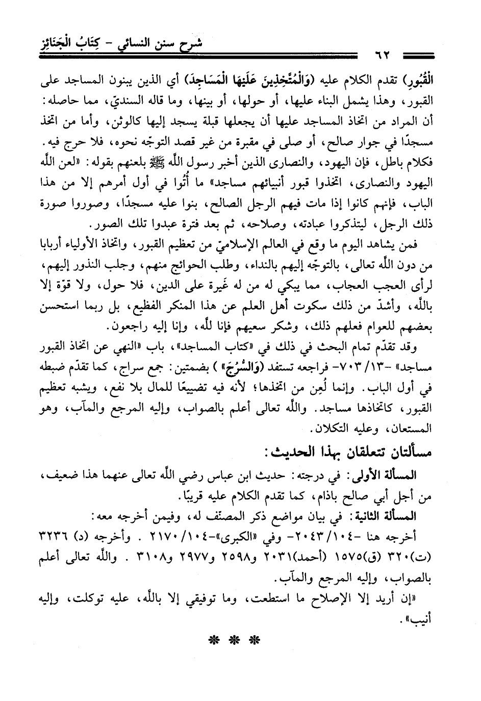 وقد تقدّم تمام البحث في ذلك في "كتاب المساجد"، باب "النهي عن اتخاذ القبور مساجد" -13/ 703 - فراجعه تستفد (وَالسُّرُجَ") بضمتين: جمع سراج، كما تقدّم ضبطه في أول الباب. وإنما لُعِن من اتخذها؛ لأنه فيه تضييعًا للمال بلا نفع، ويشبه تعظيم القبور، كاتخاذها مساجد. واللَّه تعالى أعلم بالصواب، وإليه المرجع والمآب، وهو المستعان، وعليه التكلان.