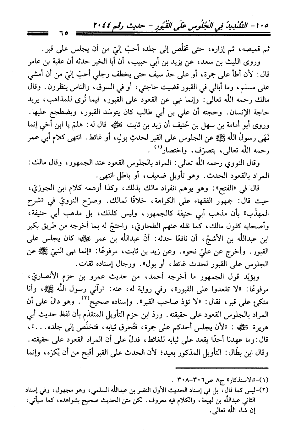 وروى أبو أمامة بن سهل بن حُنيف أن زيد بن ثابت - رضي اللَّه عنه - قال له: هلمّ يا ابن أخي إنما نَهَى رسولُ اللَّه - صلى اللَّه عليه وسلم - عن الجلوس على القبر لحدثِ بولٍ، أو غائط. انتهى كلام أبي عمر -رَحِمَهُ اللَّهُ تَعَالَى-، بتصرّف، واختصار (¬1).