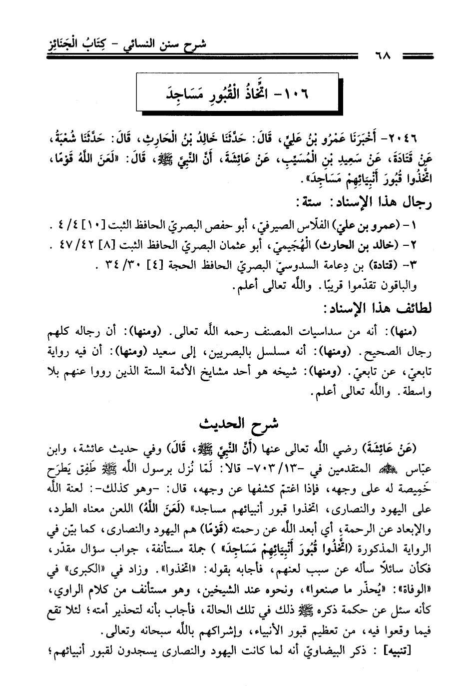 2046 - أَخْبَرَنَا عَمْرُو بْنُ عَلِيٍّ, حَدَّثَنَا خَالِدُ بْنُ الْحَارِثِ, قَالَ: حَدَّثَنَا شُعْبَةُ, عَنْ قَتَادَةَ, عَنْ سَعِيدِ بْنِ الْمُسَيَّبِ, عَنْ عَائِشَةَ, أَنَّ النَّبِيَّ - صلى اللَّه عليه وسلم -, قَالَ: «لَعَنَ اللَّهُ قَوْمًا, اتَّخَذُوا قُبُورَ أَنْبِيَائِهِمْ مَسَاجِدَ».