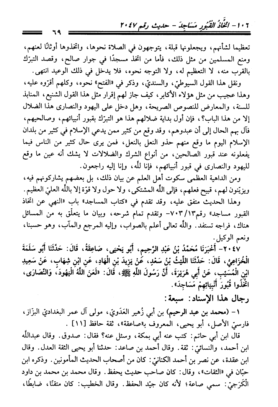 2047 - أَخْبَرَنَا مُحَمَّدُ بْنُ عَبْدِ الرَّحِيمِ, أَبُو يَحْيَى, صَاعِقَةُ, قَالَ: حَدَّثَنَا أَبُو سَلَمَةَ الْخُزَاعِيُّ قَالَ: حَدَّثَنَا اللَّيْثُ بْنُ سَعْدٍ, عَنْ يَزِيدَ بْنِ الْهَادِ, عَنِ ابْنِ شِهَابٍ, عَنْ سَعِيدِ بْنِ الْمُسَيَّبِ, عَنْ أَبِي هُرَيْرَةَ, أَنَّ رَسُولَ اللَّهِ - صلى اللَّه عليه وسلم -, قَالَ: «لَعَنَ اللَّهُ الْيَهُودَ, وَالنَّصَارَى, اتَّخَذُوا قُبُورَ أَنْبِيَائِهِمْ مَسَاجِدَ».