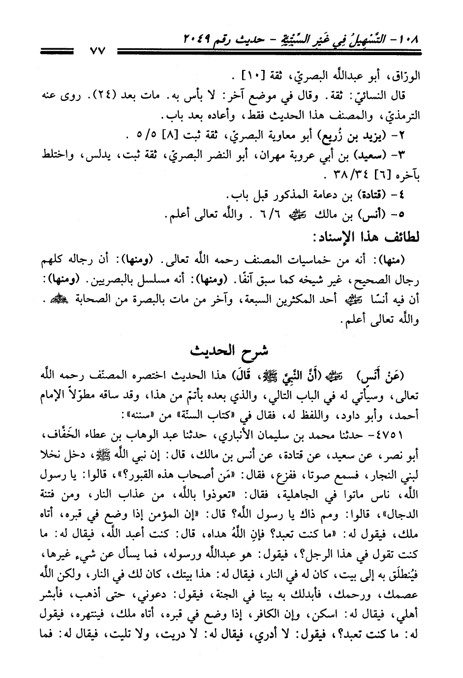 4751 - حدثنا محمد بن سليمان الأنباري، حدثنا عبد الوهاب بن عطاء الخَفَّاف، أبو نصر، عن سعيد، عن قتادة، عن أنس بن مالك، قال: إن نبي اللَّه - صلى اللَّه عليه وسلم -، دخل نخلا لبني النجار، فسمع صوتا، ففزع، فقال: "مَن أصحاب هذه القبور؟ "، قالوا: يا رسول اللَّه، ناس ماتوا في الجاهلية، فقال: "تعوذوا باللَّه، من عذاب النار، ومن فتنة الدجال"، قالوا: ومم ذاك يا رسول اللَّه؟ قال: "إن المؤمن إذا وضع في قبره، أتاه ملك، فيقول له: "ما كنت تعبد؟ فإنِ اللَّهُ هداه، قال: كنت أعبد اللَّه، فيقال له: ما كنت تقول في هذا الرجل؟، فيقول: هو عبد اللَّه ورسوله، فما يسأل عن شيء غيرها، فيُنطلَق به إلى بيت، كان له في النار، فيقال له: هذا بيتك، كان لك في النار، ولكن اللَّه عصمك، ورحمك، فأبدلك به بيتا في الجنة، فيقول: دعوني، حتى أذهب، فأبشر أهلي، فيقال له: اسكن، وإن الكافر، إذا وضع في قبره، أتاه ملك، فينتهره، فيقول له: ما كنت تعبد؟، فيقول: لا أدري، فيقال له: لا دريت، ولا تليت، فيقال له: فما