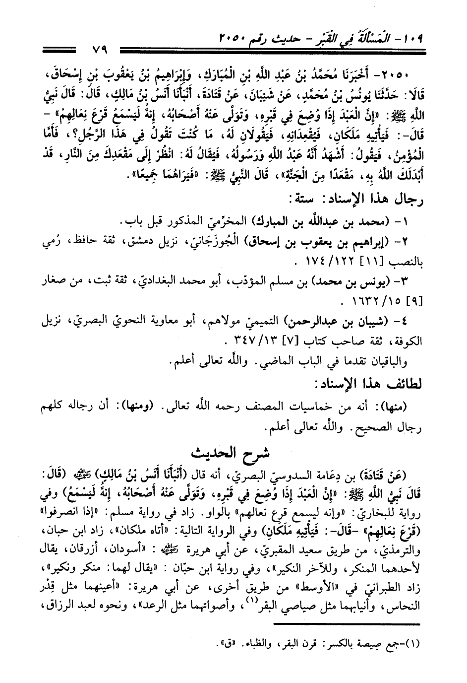 2050 - أَخْبَرَنَا مُحَمَّدُ بْنُ عَبْدِ اللَّهِ بْنِ الْمُبَارَكِ, وَإِبْرَاهِيمُ بْنُ يَعْقُوبَ بْنِ إِسْحَاقَ, قَالاَ: حَدَّثَنَا يُونُسُ بْنُ مُحَمَّدٍ, عَنْ شَيْبَانَ, عَنْ قَتَادَةَ, أَنْبَأَنَا أَنَسُ بْنُ مَالِكٍ, قَالَ: قَالَ نَبِيُّ اللَّهِ - صلى اللَّه عليه وسلم -: «إِنَّ الْعَبْدَ إِذَا وُضِعَ فِي قَبْرِهِ, وَتَوَلَّى عَنْهُ أَصْحَابُهُ, إِنَّهُ لَيَسْمَعُ قَرْعَ نِعَالِهِمْ» -قَالَ-: «فَيَأْتِيهِ مَلَكَانِ, فَيُقْعِدَانِهِ, فَيَقُولاَنِ لَهُ, مَا كُنْتَ تَقُولُ فِي هَذَا الرَّجُلِ؟ , فَأَمَّا الْمُؤْمِنُ, فَيَقُولُ: أَشْهَدُ أَنَّهُ عَبْدُ اللَّهِ وَرَسُولُهُ, فَيُقَالُ لَهُ: انْظُرْ إِلَى مَقْعَدِكَ مِنَ النَّارِ, قَدْ أَبْدَلَكَ اللَّهُ بِهِ, مَقْعَدًا مِنَ الْجَنَّةِ» , قَالَ: النَّبِيُّ - صلى اللَّه عليه وسلم - «فَيَرَاهُمَا جَمِيعًا».